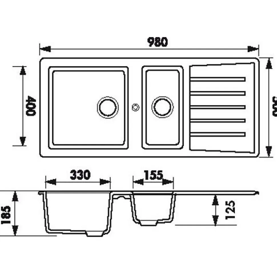 POINTS FORTS : • Évier encastrable 98×50 cm • • Meuble sous évier 60 cm minimum • • Evier vidage manuel • • Évier réversible CARACTÉRISTIQUES : • Équipements inclus : bonde(s), siphon, trop plein, tuyaux d’évacuation • Marque : Ewi • Matériau : Résine • Type de pose : à encastrer • Positionnement égouttoir : réversible • Coloris : Blanc • Emplacement robinetterie : non percé • Nombre de bacs : 1 bac 1/2 • Poids net (Kg) : 7.2 • Trop plein : oui • Sous-meuble : 60 cm • Longueur (mm) : 980 • Largeur (mm) : 500 • Longueur d’encastrement (mm) : 940 • Largeur d’encastrement (mm) : 460 • Grande dimension cuve 1 (mm) : 400 • Petite dimension cuve 1 (mm) : 330 • Profondeur cuve 1 (mm) : 185 • Diamètre bonde cuve 1 (mm) : 90 • Grande dimension cuve 2 (mm) : 400 • Petite dimension cuve 2 (mm) : 155 • Profondeur cuve 2 (mm) : 125 • Diamètre bonde cuve 2 (mm) : 90 • Bon à savoir : Le petit bac est à écoulement libre • Vidage : manuel • Référence vidage : le vidage est déjà inclus