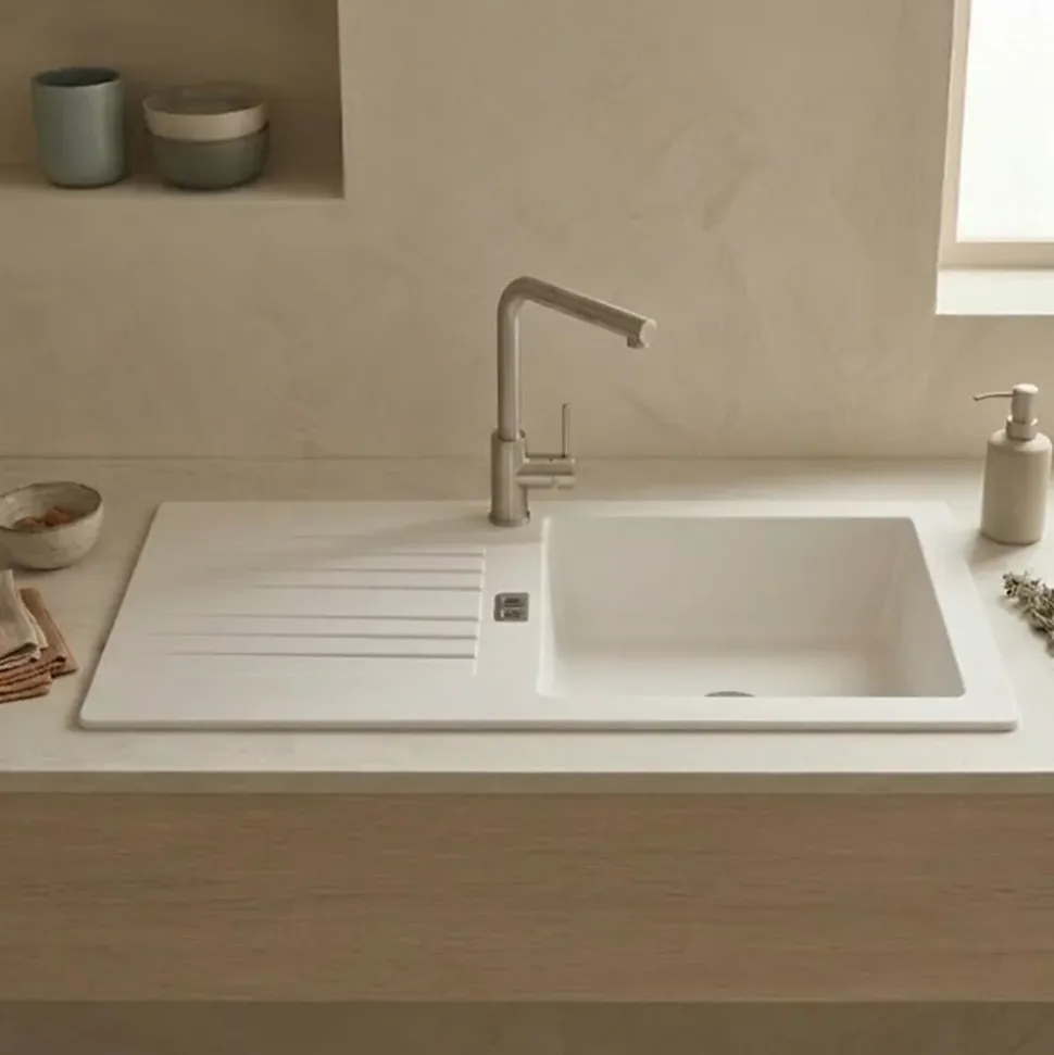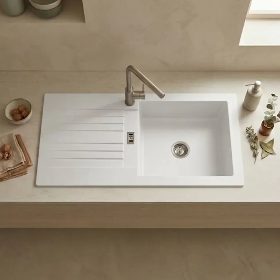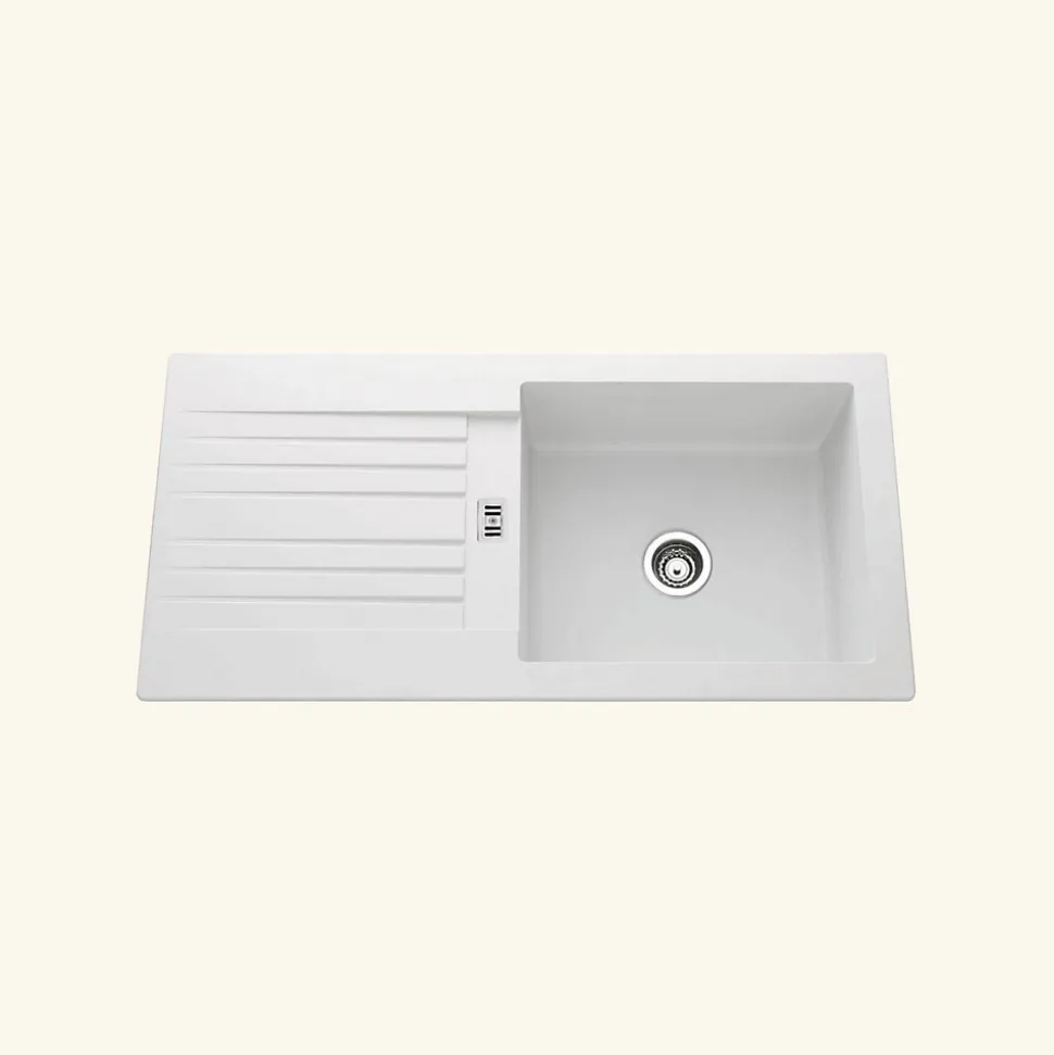 POINTS FORTS : • Évier encastrable 100×50 cm • • Meuble sous évier 60 cm minimum • • Evier vidage manuel • • Évier réversible CARACTÉRISTIQUES : • Équipements inclus : bonde(s), siphon, trop plein, tuyaux d’évacuation • Marque : sans marque • Matériau : Résine • Type de pose : à encastrer • Positionnement égouttoir : réversible • Coloris : Blanc • Emplacement robinetterie : non percé • Nombre de bacs : 1 bac • Poids net (Kg) : 6.76 • Trop plein : oui • Sous-meuble : 60 cm • Longueur (mm) : 1000 • Largeur (mm) : 500 • Longueur d’encastrement (mm) : 960 • Largeur d’encastrement (mm) : 460 • Grande dimension cuve 1 (mm) : 460 • Petite dimension cuve 1 (mm) : 400 • Profondeur cuve 1 (mm) : 185 • Diamètre bonde cuve 1 (mm) : 90 • Grande dimension cuve 2 (mm) : non disponible • Petite dimension cuve 2 (mm) : non disponible • Profondeur cuve 2 (mm) : non disponible • Diamètre bonde cuve 2 (mm) : non disponible • Bon à savoir : ce produit ne présente pas de spécificités supplémentaires • Vidage : manuel • Référence vidage : le vidage est déjà inclus