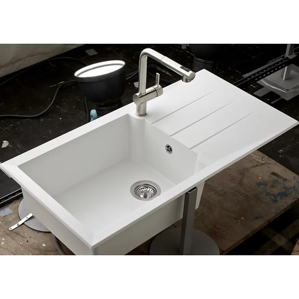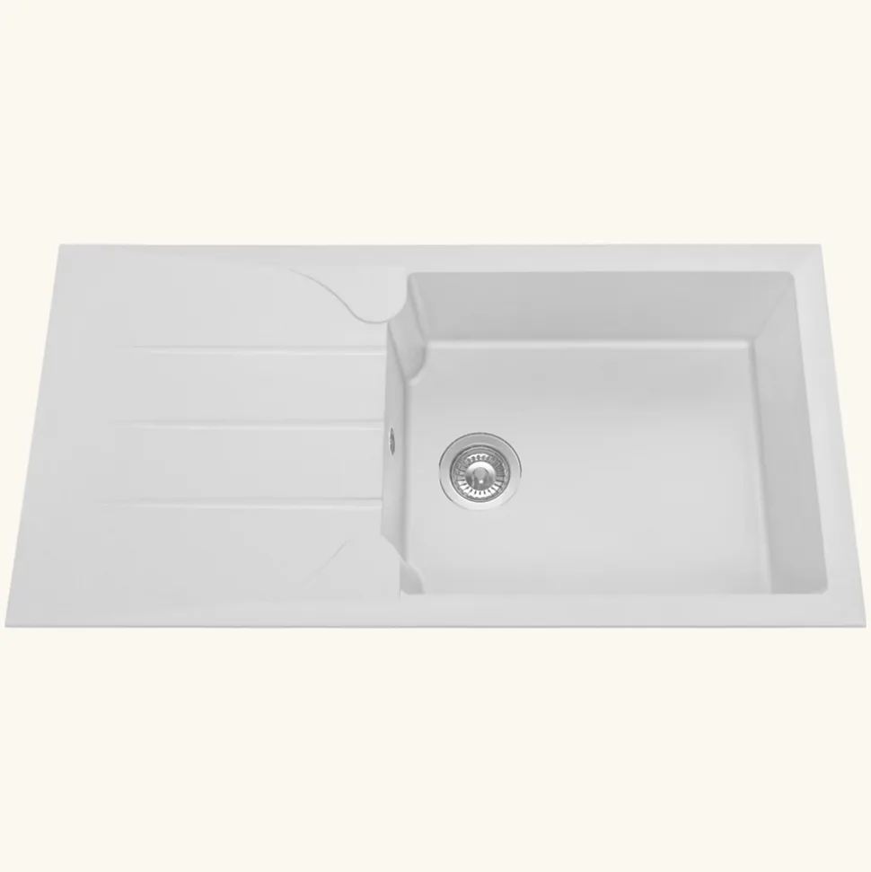 POINTS FORTS : • Évier encastrable 100×50 cm •• Meuble sous évier 60 cm minimum •• Evier vidage manuel •• Évier réversible fabriqué en France CARACTÉRISTIQUES : • Équipements inclus : bonde(s), siphon, trop plein, tuyaux d’évacuation • Marque : Kümbad • Matériau : Résine • Type de pose : à encastrer • Positionnement égouttoir : réversible • Coloris : Blanc • Emplacement robinetterie : non percé • Nombre de bacs : 1 bac • Poids net (Kg) : 9.8 • Trop plein : oui • Sous-meuble : 60 cm • Longueur (mm) : 1000 • Largeur (mm) : 500 • Longueur d’encastrement (mm) : 980 • Largeur d’encastrement (mm) : 480 • Grande dimension cuve 1 (mm) : 526 • Petite dimension cuve 1 (mm) : 420 • Profondeur cuve 1 (mm) : 210 • Diamètre bonde cuve 1 (mm) : 90 • Grande dimension cuve 2 (mm) : non disponible • Petite dimension cuve 2 (mm) : non disponible • Profondeur cuve 2 (mm) : non disponible • Diamètre bonde cuve 2 (mm) : non disponible • Bon à savoir : ce produit ne présente pas de spécificités supplémentaires • Vidage : manuel • Référence vidage : le vidage est déjà inclus