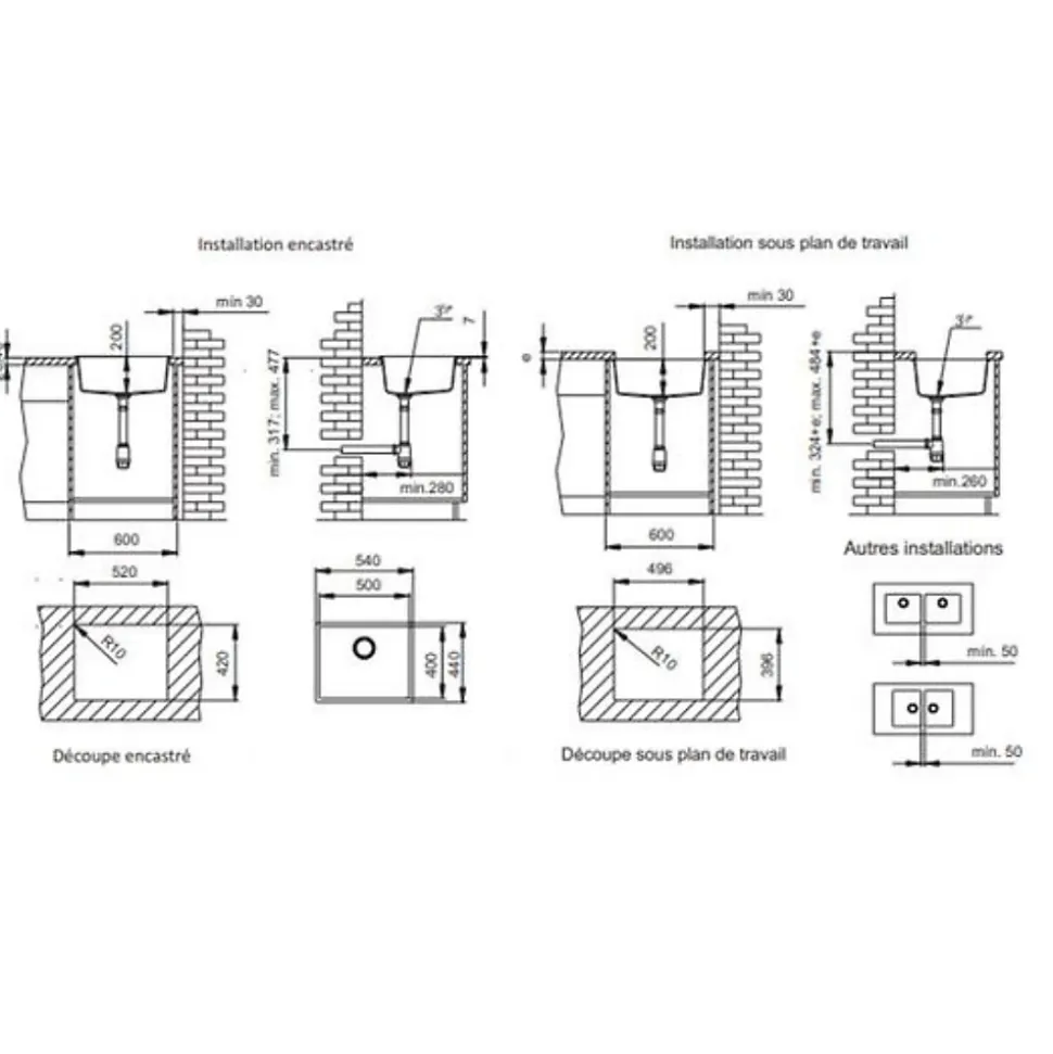 - Évier encastrable cuve 50×40 cm