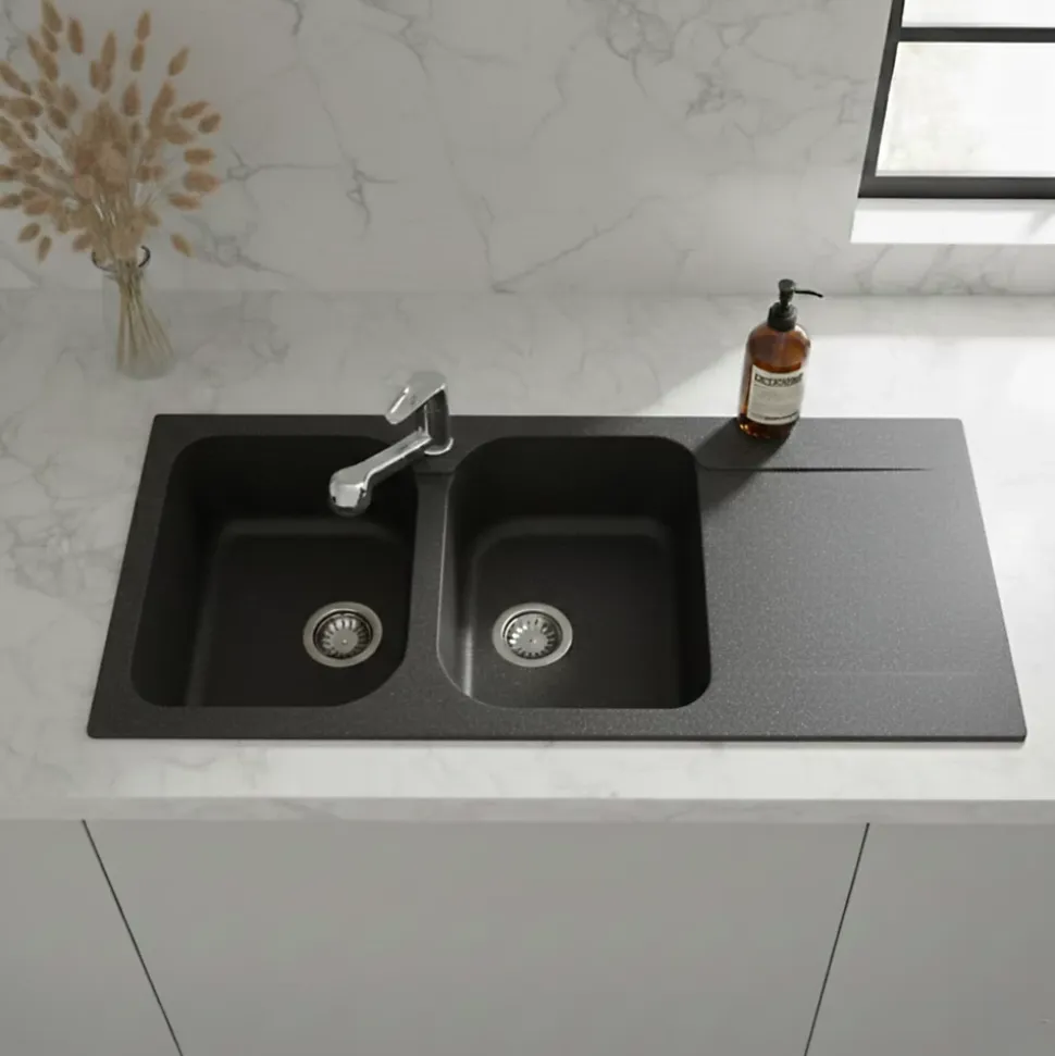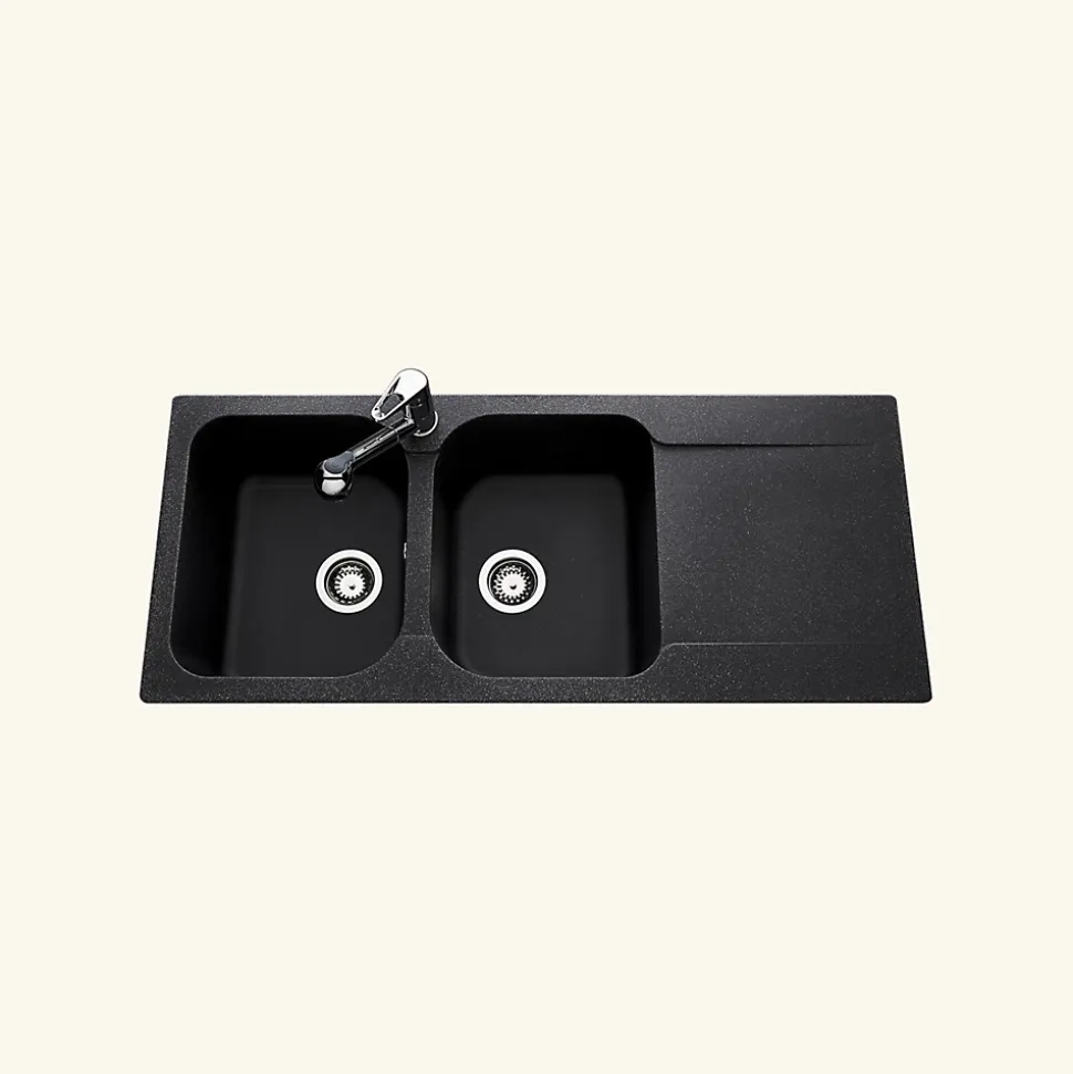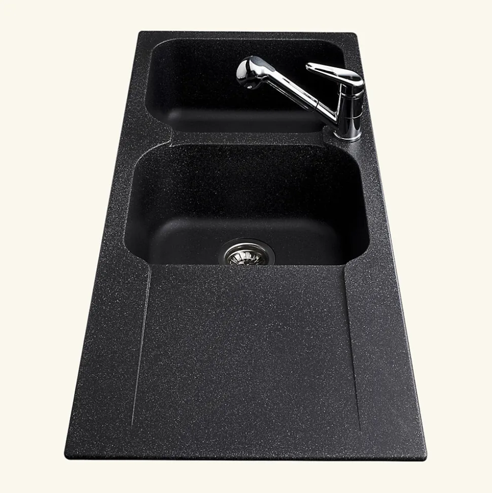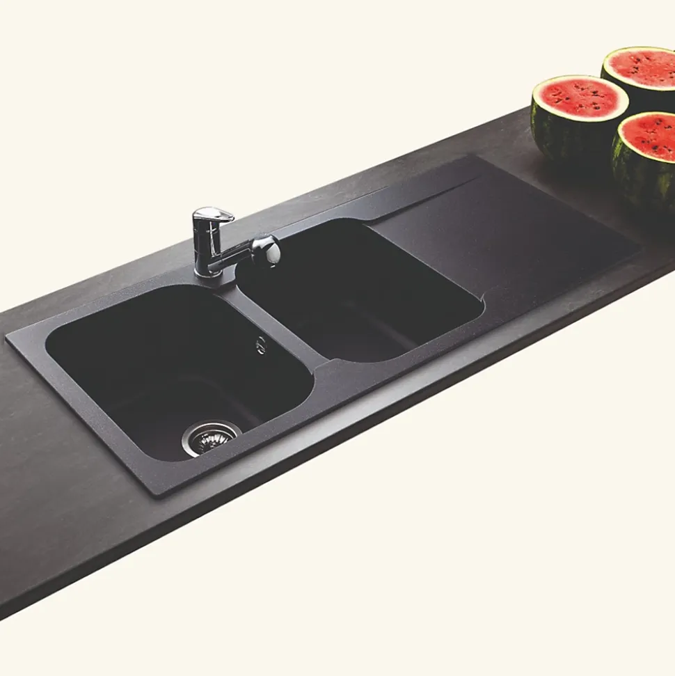 POINTS FORTS : • Évier encastrable 116×50 cm •• Meuble sous évier 80 cm minimum •• Evier vidage manuel •• Évier réversible CARACTÉRISTIQUES : • Équipements inclus : bonde(s), siphon, trop plein, tuyaux d’évacuation • Marque : Ewi • Matériau : Résine • Type de pose : à encastrer • Positionnement égouttoir : réversible • Coloris : Noir • Emplacement robinetterie : non percé • Nombre de bacs : 2 bacs • Poids net (Kg) : 10.0 • Trop plein : oui • Sous-meuble : 80 cm • Longueur (mm) : 1160 • Largeur (mm) : 500 • Longueur d’encastrement (mm) : 1136 • Largeur d’encastrement (mm) : 476 • Grande dimension cuve 1 (mm) : 340 • Petite dimension cuve 1 (mm) : 340 • Profondeur cuve 1 (mm) : 212 • Diamètre bonde cuve 1 (mm) : 90 • Grande dimension cuve 2 (mm) : 420 • Petite dimension cuve 2 (mm) : 340 • Profondeur cuve 2 (mm) : 212 • Diamètre bonde cuve 2 (mm) : 90 • Bon à savoir : ce produit ne présente pas de spécificités supplémentaires • Vidage : manuel • Référence vidage : le vidage est déjà inclus