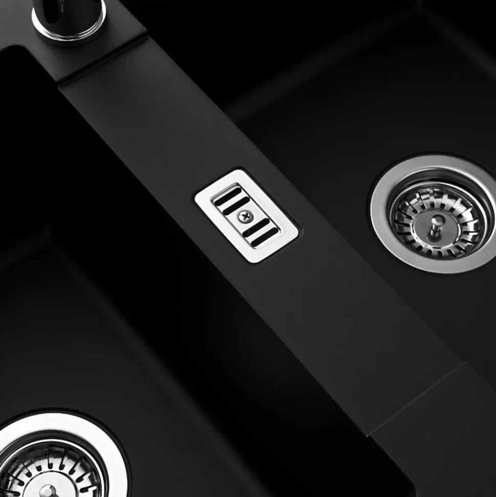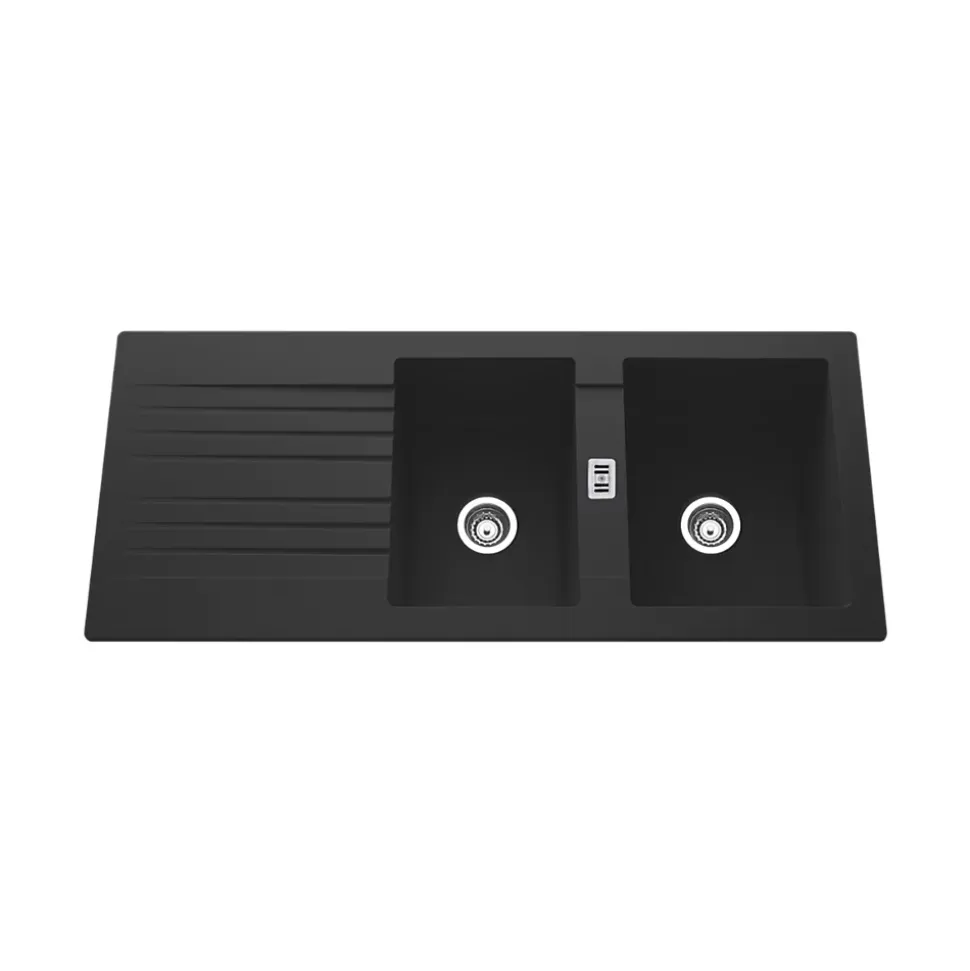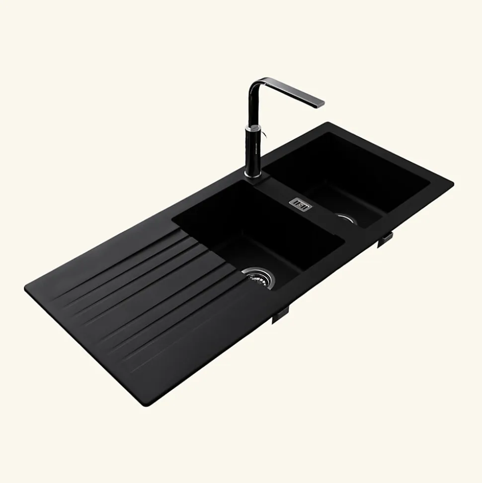 POINTS FORTS : • Évier encastrable 116×50 cm • • Meuble sous évier 80 cm minimum • • Evier vidage manuel • • Évier réversible CARACTÉRISTIQUES : • Équipements inclus : bonde(s), siphon, trop plein, tuyaux d’évacuation • Marque : sans marque • Matériau : Résine • Type de pose : à encastrer • Positionnement égouttoir : réversible • Coloris : Noir • Emplacement robinetterie : non percé • Nombre de bacs : 2 bacs • Poids net (Kg) : 8.78 • Trop plein : oui • Sous-meuble : 80 cm • Longueur (mm) : 1160 • Largeur (mm) : 500 • Longueur d’encastrement (mm) : 1140 • Largeur d’encastrement (mm) : 480 • Grande dimension cuve 1 (mm) : 400 • Petite dimension cuve 1 (mm) : 320 • Profondeur cuve 1 (mm) : 195 • Diamètre bonde cuve 1 (mm) : 90 • Grande dimension cuve 2 (mm) : 400 • Petite dimension cuve 2 (mm) : 280 • Profondeur cuve 2 (mm) : 2195 • Diamètre bonde cuve 2 (mm) : 90 • Bon à savoir : ce produit ne présente pas de spécificités supplémentaires • Vidage : manuel • Référence vidage : le vidage est déjà inclus