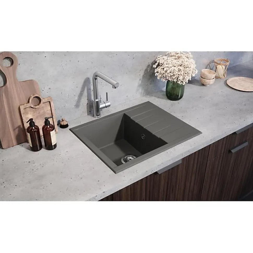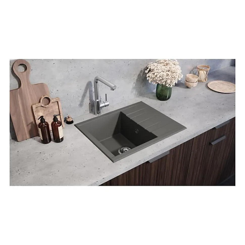 - Évier compact 1 bac en résine SMC, idéal pour petites cuisines ; finition gris béton mate, design cube moderne.