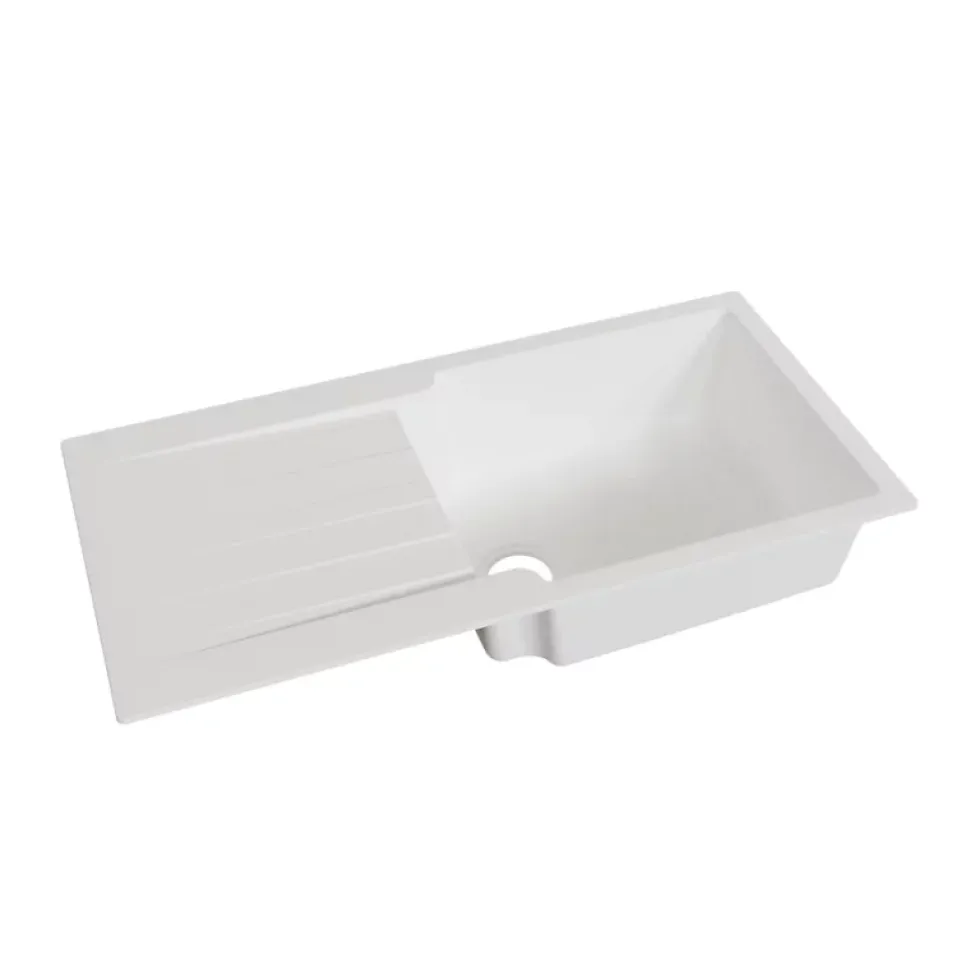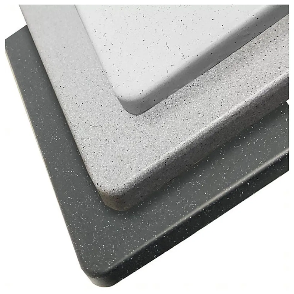 Nos cuves et éviers de cuisine RESIROC sont élaborés à partir de matériaux composites SMC-PIMC (résine polyester, fibre de verre et charges minérales compressées + recouvrement de poudres électrostatiques projetées sur le moule à chaud). Cette composition permet aux cuves RESIROC d’avoir une haute résistance aux rayures, chocs et températures élevées.Évier réversible 100 cm, grand bac avec égouttoir mouléCouleur : BlancDimension en cm : 100 x 50 cmIntérieur de la cuve : 52.5 x 43 cmEncastrement : 97,6 x 47,6 cmProfondeur de l’évier : 21 cmEvier avec trop-pleinVidage en acier inoxydable inclus Vidage manuel de la bonde panierA noter : Livré avec bonde mais sans robinetterie.Normes et labels de la plus haute qualité :Norme CE selon de règlement Européen des produits de construction Nº 305/2011Antibactérien, antivirusRésistant aux tâchesHaute résistance aux rayons UV contre le jaunissementRésistant au choc thermique et aux hautes températures (accepte une température jusqu’à 300°)Résistant aux chocs mécaniquesRésistant aux rayuresLéger et facile à manipuler et à installerPerçage facile : centres pré-marquésNettoyage facileFabrication EuropéenneRéglementations EN13310, EN274, EN695Garantie 3 ans*La garantie pour défaut de matière et/ou de fabrication est acquise à l’acheteur, pendant la durée énoncée, sous réserve que l’installation et l’utilisation du produit concerné soient conformes aux règles habituelles en la matière.