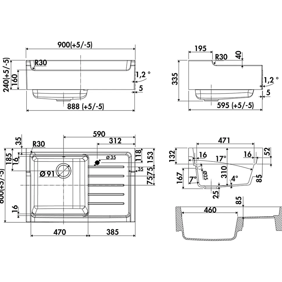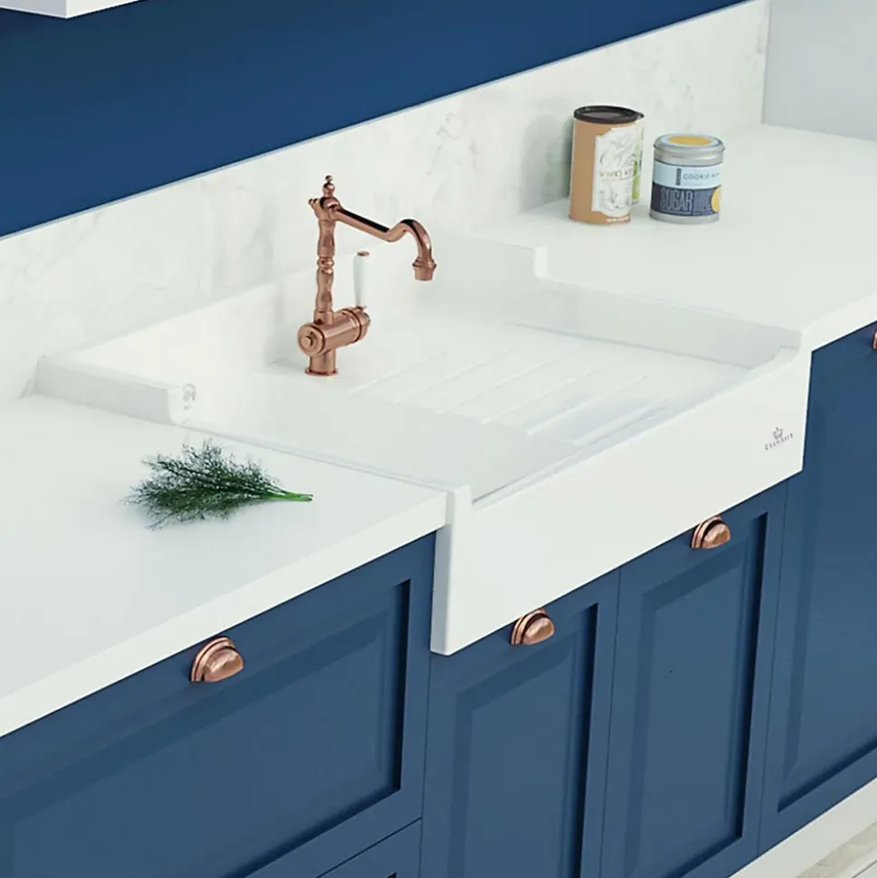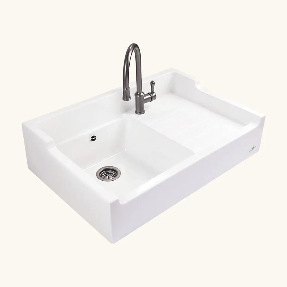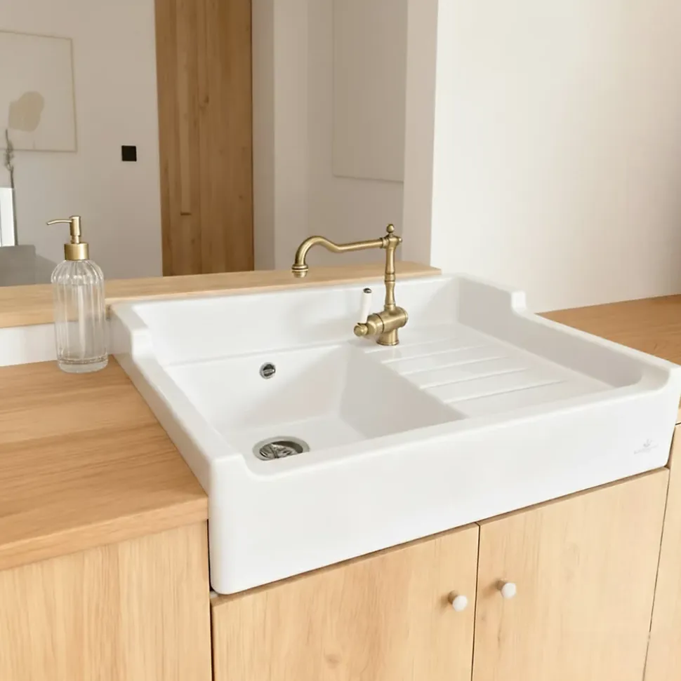 POINTS FORTS : • Évier timbre 89×61 cm •• Convient à un meuble sous évier de 90 cm •• Evier vidage manuel •• Égouttoir à droite CARACTÉRISTIQUES : • Équipements inclus : bonde(s), siphon, trop plein, tuyaux d’évacuation • Marque : Chambord • Matériau : Céramique • Type de pose : à poser • Positionnement égouttoir : droite • Coloris : Blanc • Emplacement robinetterie : percé • Nombre de bacs : 1 bac • Poids net (Kg) : 47.0 • Trop plein : oui • Sous-meuble : 90 cm • Longueur (mm) : 890 (+/-3 mm) • Largeur (mm) : 610 (+/-3 mm) • Longueur d’encastrement (mm) : non disponible • Largeur d’encastrement (mm) : • Grande dimension cuve 1 (mm) : 470 • Petite dimension cuve 1 (mm) : 460 • Profondeur cuve 1 (mm) : 167 • Diamètre bonde cuve 1 (mm) : 90 • Grande dimension cuve 2 (mm) : non disponible • Petite dimension cuve 2 (mm) : non disponible • Profondeur cuve 2 (mm) : non disponible • Diamètre bonde cuve 2 (mm) : non disponible • Bon à savoir : une variation de +/- 1% sur les dimensions est acceptable / Le sous-meuble n’est pas livré avec l’évier/ Non émaillé à l’arrière • Vidage : manuel • Référence vidage : le vidage est déjà inclus