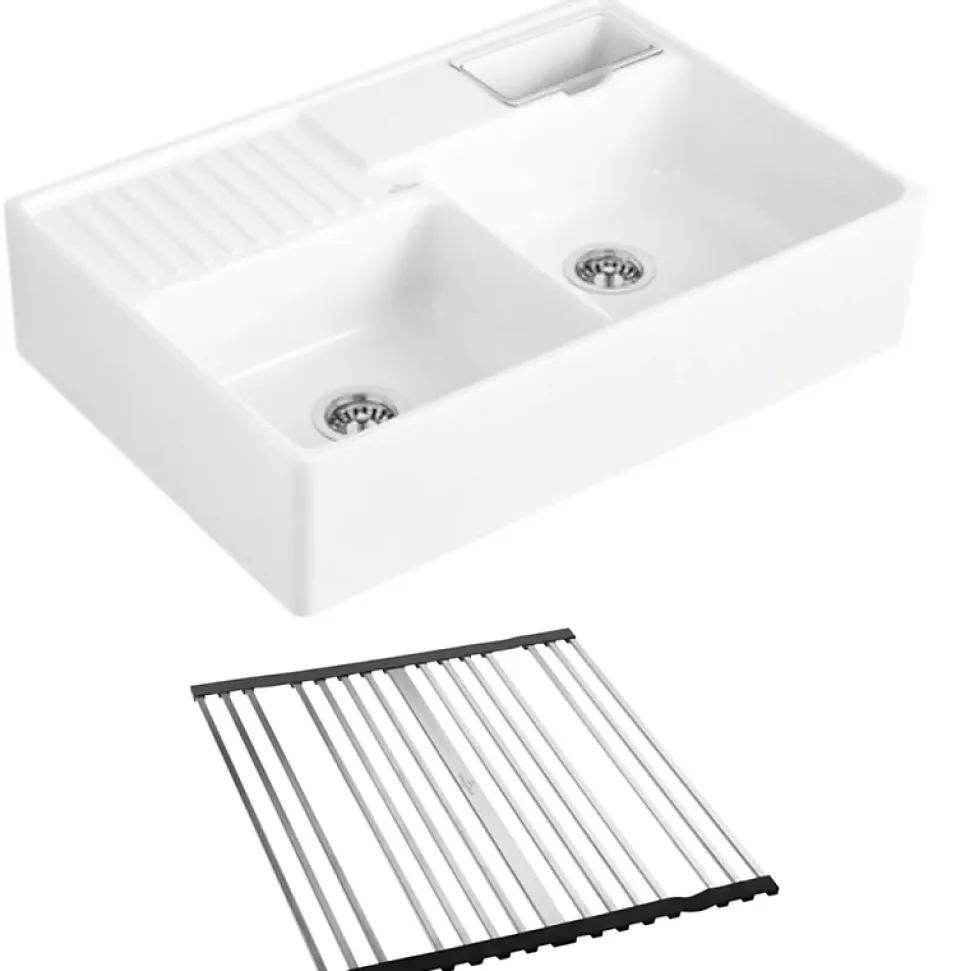 Caractéristiques de l’évier timbre d’office Tradition Villeroy et BochEvier Tradition (2 cuves) Matériau : céramique Dimensions: 895 x 220 x 630 mm 2 cuves Set de fixation pour montage sur meuble sous-évier Dimension minimale du meuble sous évier: 90 cm 2 trous amorcés 2 cuves pouvant être fermées Garantie : 15 ansLa face arrière de l’évier n’est pas émaillé Dimensions de l’evier timbre office Villeroy et Boch Tradition Longueur x Largeur : 89,5 x 63 cmHauteur : 22 cmTailleur cuve de gauche : 36,4 x 42,5 cmTailleur cuve de droite : 42,9 x 42,5 cmProfondeur des 2 bacs :18 cm Avantages et caractéristiques de l’égouttoir déroulable Villeroy et Boch Égouttoir déroulable en inox (Stainless Steel)Résistant à une chaleur de 280 °CDesign moderneRésistant à la rouillePasse au lave-vaisselleLongueur : 43,9 cmLargeur : 45 cmHauteur : 8 cm