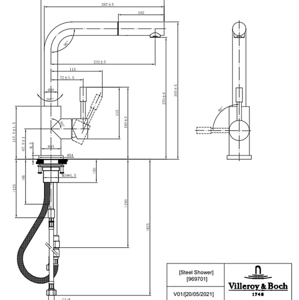 Points forts de l’évier 1 cuve 1/2 Subway Pure 60Design épuréÉviers en céramique de haute qualité composés de matières premières 100 %sMatières premières 100 %sExcellente résistance aux chocs et aux rayures et très faible risque de détériorationSurfaces parfaitement étanches pour un nettoyage facile et des surfaces hygiéniquesCaractéristiques de l’évier 1 cuve 1/2 Subway Pure 60Évier à encastrer par-dessusCéramiqueEgouttoir à droiteÉvier non réversible1 Cuve 1/2Dimensions : 100 x 51 cmDécoupe du plan de travail : 97 x 48 cmDimension minimale du meuble sous évier: 60 cm2 trous percésAvec vidage automatique (cet évier n’existe pas avec vidage manuel)Les avantages du Robinet cuisine VILLEROY ET BOCH Steel ShowerHauteur offrant une liberté de mouvement, condition parfaite pour faciliter le nettoyage et remplir de grand récipientsJet confort : jet ventilé parfaitement calibré pour économiser de l’eau sans aucune perte de confortPivotement complet à 360° pour une flexibilité totale sur l’évierRevêtement anti-traces et anti-tachesInstallation simple et rapide grâce à des composants de haute qualité et standardisésRobinet de cuisine en acier inoxydable 100% exempt d’acide, de goût et d’émissions pour un robinet robuste, durable, extrêmement hygiéniqueDesign moderne pour sublimer votre cuisineRevêtement PVD : la surface est résistante aux UV et aux chocsBouton switch pour changer facilement de jetCaractéristiques techniques du Robinet cuisine VILLEROY ET BOCH Steel ShowerLongueur : 27,5 cmLargeur : 4,5 cmHauteur : 30,5 cmCollection : Steel ShowerMatériel : Acier inoxydableCartouche : plastique avec bague en céramiqueRayon de pivotement : 360°Angle d’ouverture du levier : 25°Débit du jet laminaire : 11,7 L / minFlexibles fournis : 60 cm