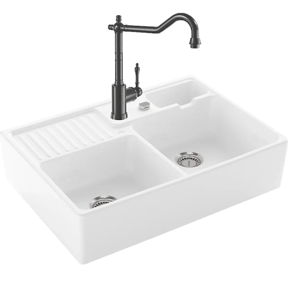 Avantages de l’évier cuisine Villeroy et Boch TraditionMatières premières 100%sRevêtement CeramicPlus hygiénique qui ne retient pas le calcaire et la saletéEvier avec vidage automatiqueFabrication FrançaiseCaractéristiques techniques du timbre office Villeroy et Boch TraditionCouleur : blancType de pose : évier pour installation sur un meuble sous évier ou bien fixé à un murMatériau : évier ceramique2 trous amorcés pour la robinetterie2 bacs pouvant être fermésLivré avec kit de fixation completGarantie : 15 ansFace arrière de l’évier non émailléDimensions de l’evier timbre office Villeroy et Boch TraditionLongueur x Largeur : 89,5 x 63 cmHauteur : 22 cmTailleur cuve de gauche : 36,4 x 42,5 cmTailleur cuve de droite : 42,9 x 42,5 cmProfondeur des 2 bacs :18 cm Les avantages du Robinet cuisine VILLEROY ET BOCH Avia 2.0Hauteur offrant une liberté de mouvementJet confort : le jet est parfaitement calibré et ventilléPivotement complet à 360°Allumage à froid pour une économie en énergieRevêtement anti-traces et anti-tachesRobinet de cuisine en acier inoxydable 100% exempt d’acide, de goût et d’émissionsCompatible avec un chauffe-eau externeRevêtement PVD : la surface est résistante aux UV et aux chocsCaractéristiques techniques du Robinet cuisine VILLEROY ET BOCH Avia 2.0Longueur : 41,7 cmLargeur : 30,7 cmHauteur : 66,5 cmMatériel : Acier inoxydableFinition : matCartouche : plastique avec bague en céramiquePivotement : 360°Angle d’ouverture du levier : 25°Débit du jet : 11,2 L / minFlexibles fournis : 60 cm