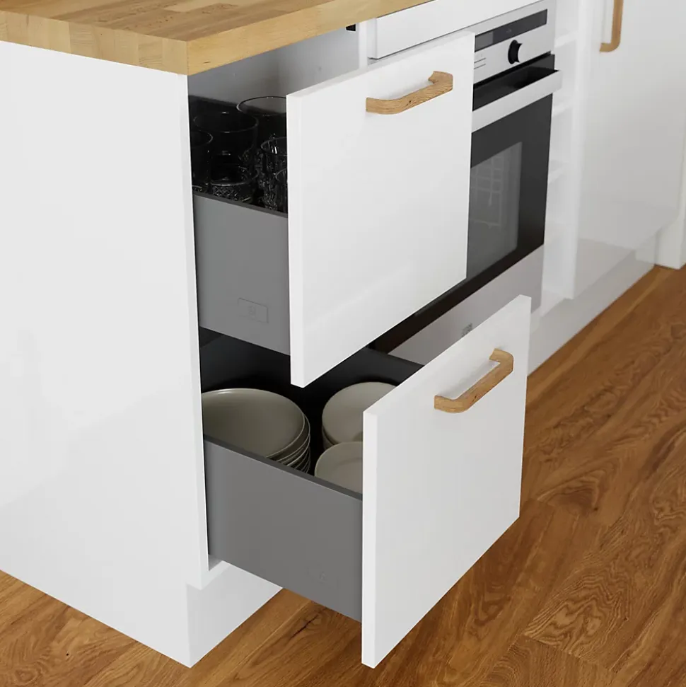 - Nous aimons tout ce qui est facile à installer, comme nos portes prépercées prêtes pour toutes les combinaisons de tiroirs et de matériel que nous proposons. Ainsi vous pouvez facilement, rapidement et correctement installer votre cuisine, sans tracas