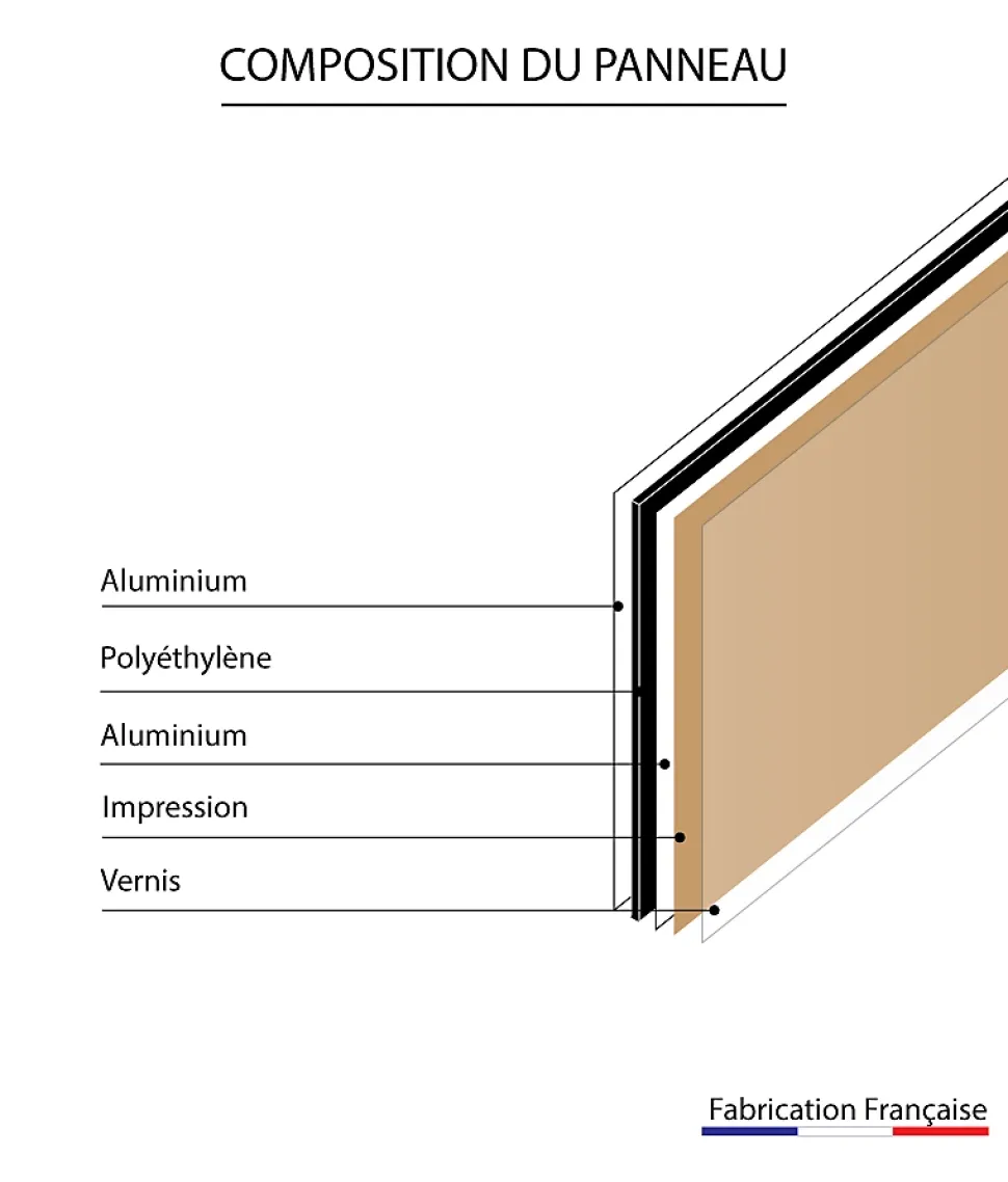 Un classique de la décoration contemporaine ou industrielle pour habiller votre cuisine, le Fond de Hotte INOX en aluminium brossé à coller sur l’ancien carrelage de votre cuisine. Facile et rapide à poser.Motifs : Aluminium brosséCouleurs : Aluminium. Fond de Hotte de cuisine 90 cm x 70 cm, en Aluminium composite d’une épaisseur de 3 mm.Résistant à la chaleur et au feu (norme M1) compatible avec une plaque de cuisson électrique ou gaz, étanche, convient aussi pour votre cuisine d’été en extérieur. 100 % Recyclable.Le motif est imprimé directement sur la plaque d’aluminium en haute définition, et protégé par un film vernis en finition mat satiné anti UV.La pose est facile, des adhésifs doubles faces sont préinstallés au verso du fond de hotte.La pose est rapide sur le support existant (placo, peinture, carrelage, bois…) préalablement nettoyé et dépoussiéré.Dans le cas d’une découpe, c’est facile avec une scie sauteuse (lame métaux), ou une scie cloche pour l’emplacement d’une prise électrique.Pour parfaire l’installation, nous conseillons de poser un joint silicone entre le fond de Hotte et le plan de travail de votre cuisine, afin d’assurer une étanchéité parfaite.Pour le nettoyage et l’entretien de votre fond de hotte de cuisine, une éponge et de l’eau savonneuse suffisent. (pas de détergents, ni d’éponge abrasive).Vous pouvez retrouver ce modèle dans des tailles différentes.Fabriqué en France.