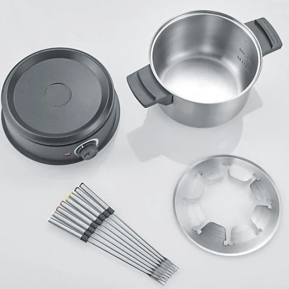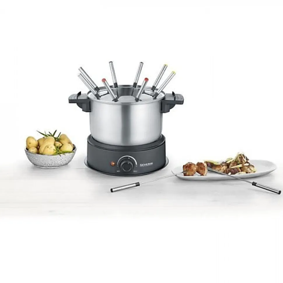 La fondue électrique SEVERIN FO2473 est idéale pour des soirées conviviales jusqu’a 8 personnes.Elle permet de réaliser des fondues savoyardes, bourguignonnes, chinoises ou au chocolat selon vos envies.Le caquelon inox amovible d’une capacité de 1,4 L est lavable au lave-vaisselle.La protection anti-projections avec fixations pour les fourchettes assure une utilisation en toute sécurité.