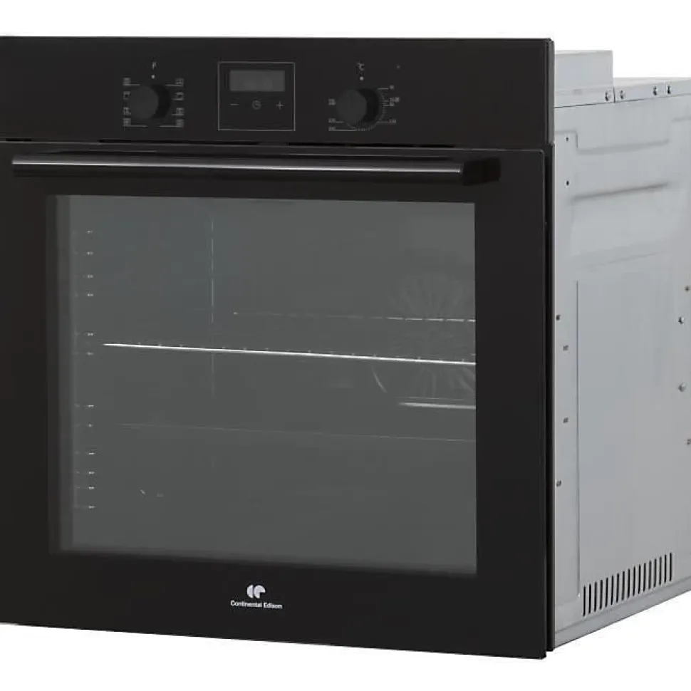 Four encastrable multifonction 80 L Continental Edison F80CBP noir avec catalyse, chaleur pulsée, programmateur digital et 8 modes de cuisson. Porte vitrée tempérée, éclairage intérieur, sécurité enfants et ventilateur de refroidissement. Puissance 2,5 kW, classe énergétique A.