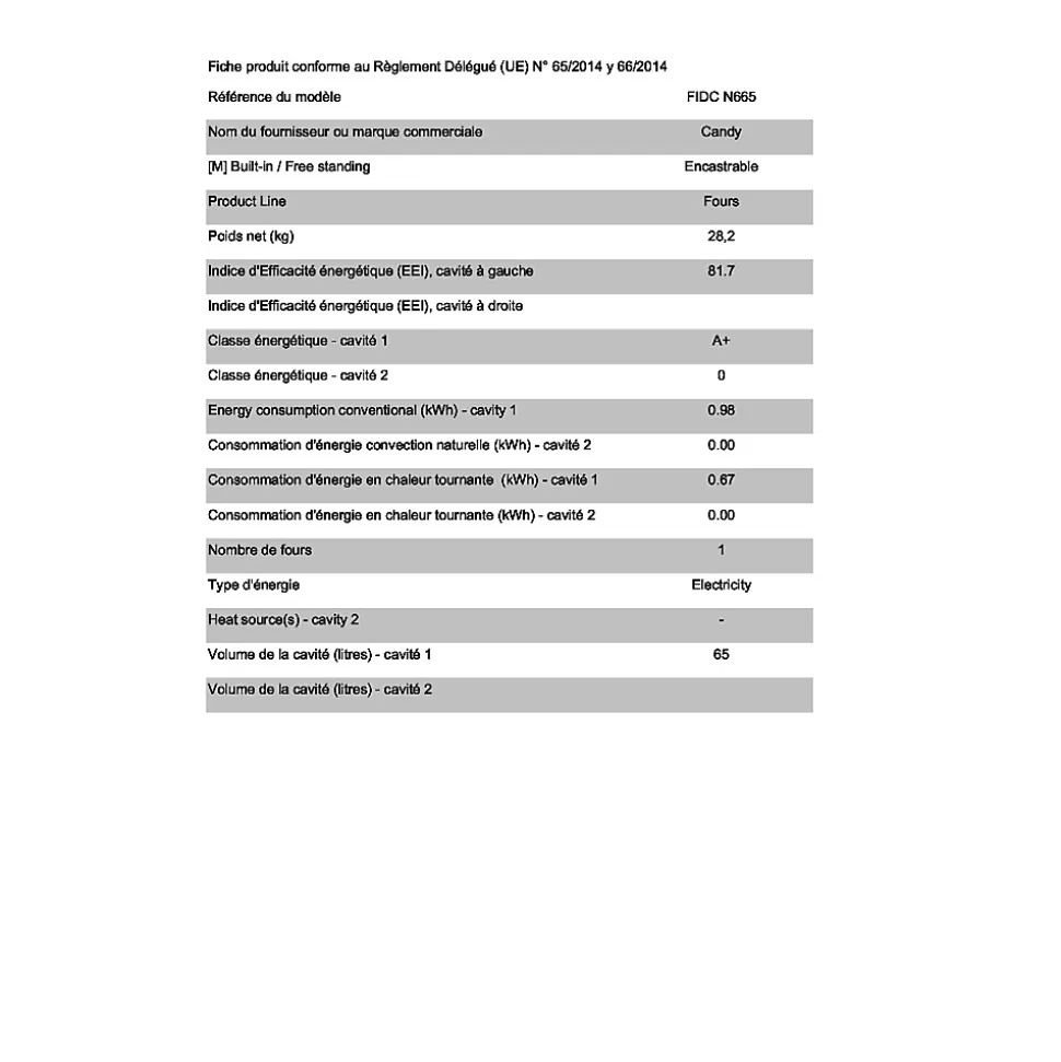 Four intégrable multifonction 65l 60cm catalyse noir Candy – Le Four intégrable multifonction IDEA FIDCN665 de Candy est doté d’un Programmateur Timer Touch. Intuitif et simple d’utilisation, ce programmateur semi-sensitif Timer Touch allie design, fonctionnalité et facilité d’entretien. Les parois catalytiques détruisent par oxydation les projections de graisse au fur et à mesure de la cuisson. Elles sont amovibles pour un entretien facilité. – Type de produit : Four catalyse.Gamme : IDEA.Indice d’efficacité énergétique (EEI cavité entière) : 81.7.Classe d’efficacité énergétique cavité entière : A+.Conso. énergie cavité entière mode conventionnel (kWh/cycle) : 0.98.Conso. énergie cavité entière mode chaleur tournante (kWh/cycle) : 0.67.Nombre de cavités : 1.Source de chaleur par cavité : Electrique.Volume cavité entière (L) : 65.Mode de cuisson : Multifonction.Nettoyage : Catalyse.Programmateur : OuiType de programmateur : Timer Touch.Connecté : Non.Puissance totale (W) : 2100.Régulation de la T°C : Electronique.Finition / Nuance : Verre.Nbre de modes de cuisson : 6.Convection naturelle : Oui.Chaleur tournante : Oui.Gril : Oui.Cuisson vapeur : Non.Décongélation : OuiAutre(s) mode(s) de cuisson : Sole brassée.Ouverture de la porte : Porte abattante.Porte froide : Non.Porte tempérée : Oui.Nbre de vitre(s) : 2.Type d’éclairage : Halogène.Sonde de cuisson : Non.Lèchefrite : Oui.Accessoire(s) inclus : 2 grilles, 1 lèchefrite.Ecran : Oui.Livré avec prise : Non.Longueur de câble : 1.35 m.Ventilateur de refroidissement : Oui.Couleur : Noir.Dim. H x L x P (cm) : 59.5 x 59.5 x 56.8.Encastrement H x L x P (cm) : 59 x 56 x 56.Poids (kg) : 28.3.