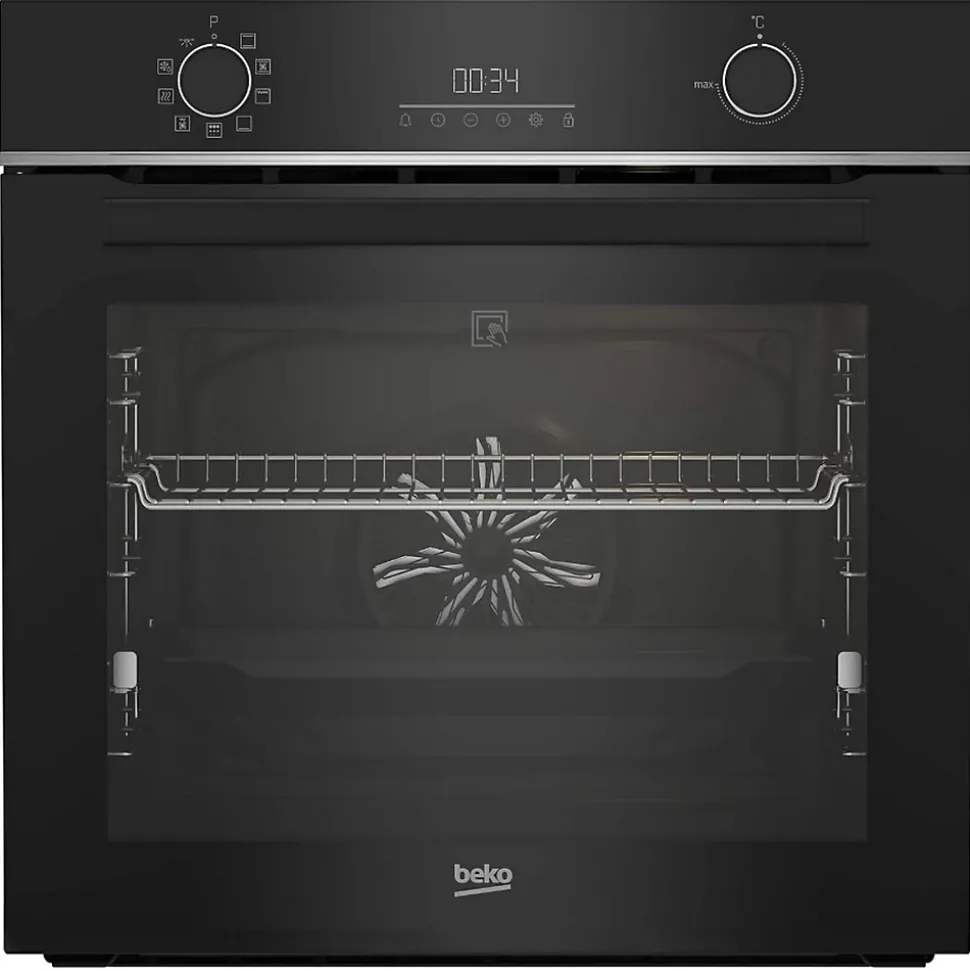 Four intégrable multifonction 72l 60cm pyrolyse noir Beko – Ce four vous garantit une cuisson économique grâce à la classe énergétique A. Grâce au système de fermeture douce, comme pour vos meubles de cuisine, votre porte se referme avec délicatesse à chaque utilisation. Le rail télescopique permet un accès simplifié et sécurisé aux plats.Il est désormais très facile d’enfourner et de retirer ses plats du four ! Porte froide Gifam : Evitez tout risque de brûlure, même en pyrolyse. Grâce à ses quatre vitres, la porte froide reste à faible température, même en mode pyrolyse lorsque le four atteint 480°C. Idéale lorsque vous avez des enfants en bas âge. En activant le nettoyage par pyrolyse, la température du four est portée à 480°C sur une durée de 2 heures, éliminant ainsi toutes les salissures. – Type de produit : Four intégrable multifonction.Indice d’efficacité énergétique (EEI cavité entière) : 95.3.Classe d’efficacité énergétique cavité entière : A.Conso. énergie cavité entière mode conventionnel (kWh/cycle) : 0.99.Conso. énergie cavité entière mode chaleur tournante (kWh/cycle) : 0.81.Nombre de cavités : 1.Source de chaleur par cavité : Electrique.Volume cavité entière (L) : 72.Type : Four pyrolyse.Mode de cuisson : Multifonction.Nettoyage : Pyrolyse.Programmateur : Oui.Connecté : Non.Puissance totale (W) : 2600.Régulation de la T°C : Mécanique.Finition / Nuance : Verre.Nbre de modes de cuisson : 9.Convection naturelle : Oui.Gril : Oui.Type de gril : Gril fort, Gril doux ventilé.Décongélation : Oui.Maintien au chaud : Oui.Autre(s) mode(s) de cuisson : Chaleur brassée, Sole.Autre(s) fonction(s) : Nettoyage vapeur.Type de porte : Fermeture douce.Ouverture de la porte : Porte abattante.Porte froide : Oui.Contre porte plein verre : Oui.Nbre de vitre(s) : 4.Touches sensitives : Oui.Type de bandeau de commande :