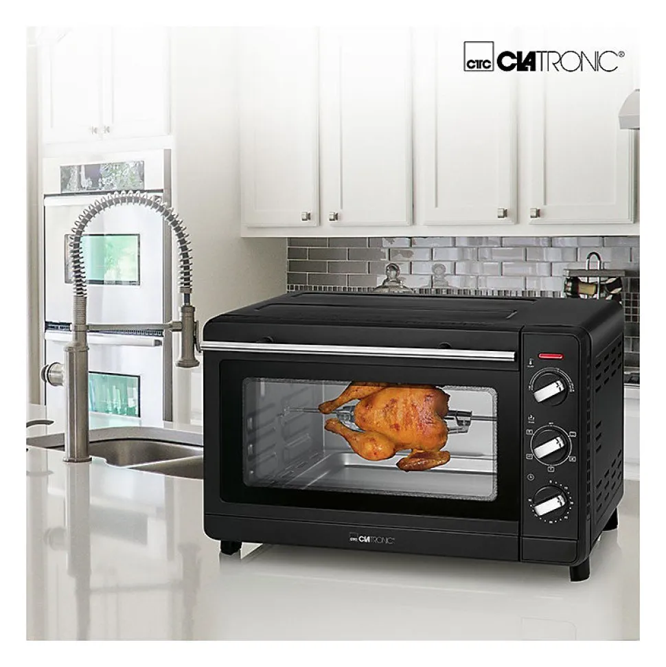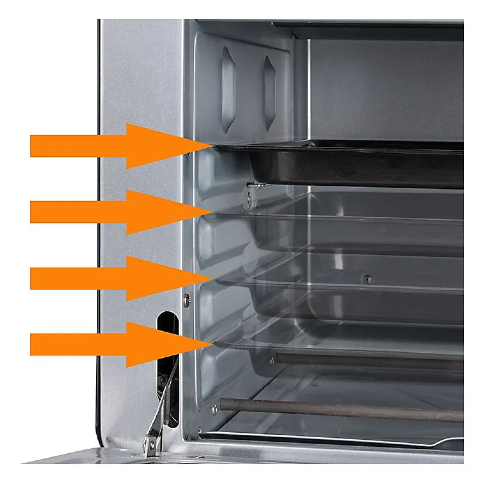 Capacité du four de 30 litresConvectionChaleur supérieure et inférieure (fonctionnement combiné)Broche tournantePierre à pizza (Ø 29 cm)Minuterie de 90 minutes avec signal de fin de cuissonInterrupteurs à 6 niveaux :- Chaleur supérieure et inférieure- Chaleur supérieure et inférieure + convection- Chaleur supérieure + convection- Chaleur supérieure + broche tournante- Chaleur supérieure et inférieure + broche tournante + convection- ArrêtRéglage progressif de la température (100°C-230°C)Voyant lumineuxPorte à double vitrage avec poignée en acier inoxydableTiroir ramasse-miettes amovibleGrille de cuisson, plaque de cuisson, broche tournante et pierre à pizza (Ø 29 cm) incluses.Pince pour retirer la grille et la plaque de cuisson, outil pour retirer la broche tournante, etc.pour retirer la broche tournanteGrande fenêtre de visualisation220-240 V, 50/60 Hz, 1500 W