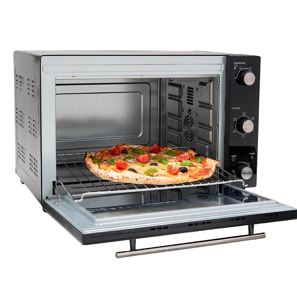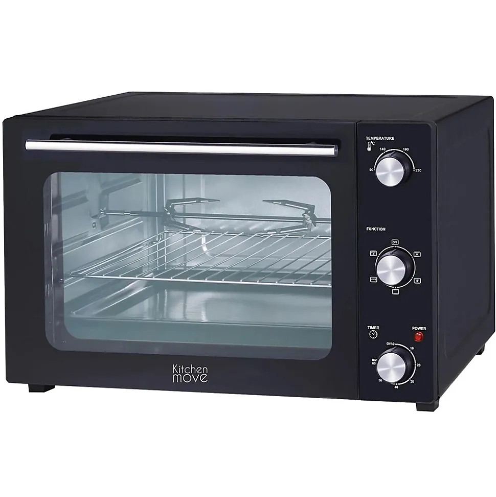 Four multifonction chaleur tournante 48l 1800w noir Kitchen Move – Four multifonction 48L chaleur tournante tournebroche grill 1800w ARIZONA noir 5 programmes de cuisson avec minuterie et accessoires.Le four électrique offre différents modes de cuisson : convection naturelle (chauffe de façon verticale) et chaleur tournante (un ventilateur répartit uniformément la chaleur à l’intérieur du four pour une répartition homogène et rapide de la chaleur).Vous pourrez également sélectionner la fonction grill pour faire gratiner vos plats et la fonction rôtissoire pour de jolis poulets rôtis ! (livré avec le tournebroche spécial rôtisserie).Grâce à ce four, vous pouvez cuisiner tous les types de recettes que vous souhaitez : entrées, viandes, poissons, frites, petits pains précuits, gâteaux, pizzas, gratins, desserts, quiches, saucisses, côtelettes.. – Four posablePuissance : 1800 WCapacité : 48 LThermostat réglable de 100 à 230 °CMinuteur de 0 à 60 minutes avec arrêt automatique et sonnerie en fin de cuissonPorte double vitrage haute résistanceCavité anti-adhésive pour un nettoyage aiséPoignée et boutons rotatifs en acier inoxydable4 pieds anti-dérapants pour un support plus stableAccessoires : grille, lèchefrite, tournebroche et poignées (1 poignée pour le tournebroche et 1 poignée pour la plaque/lèchefrite)Dimensions : 57 x 45 x H37 cmPoids : 11.8 kg