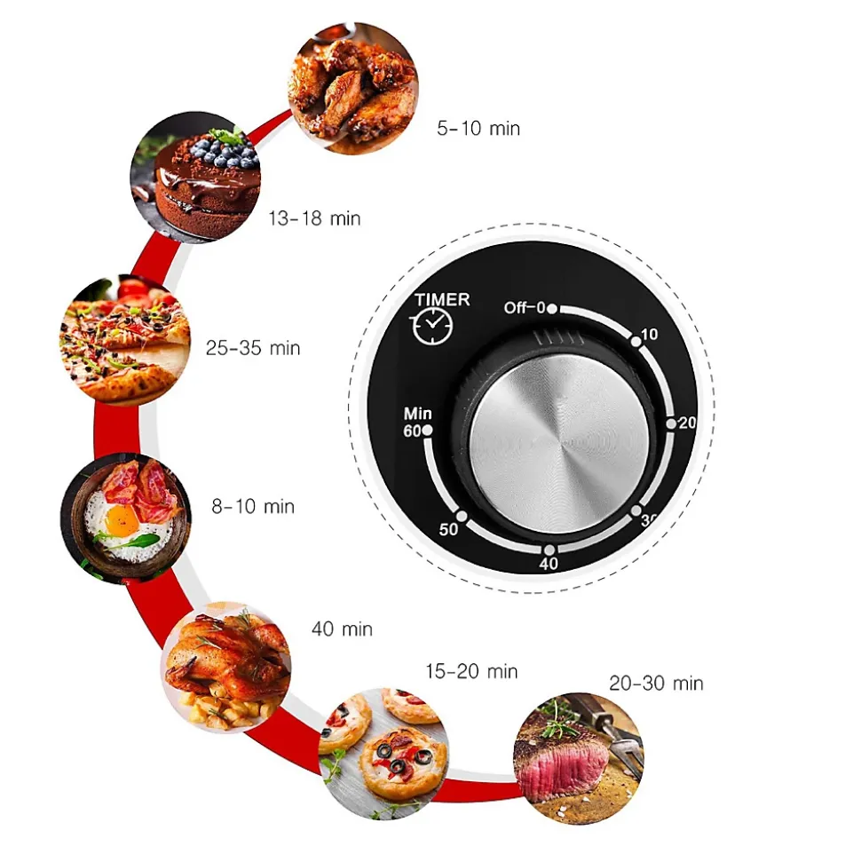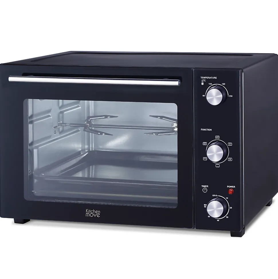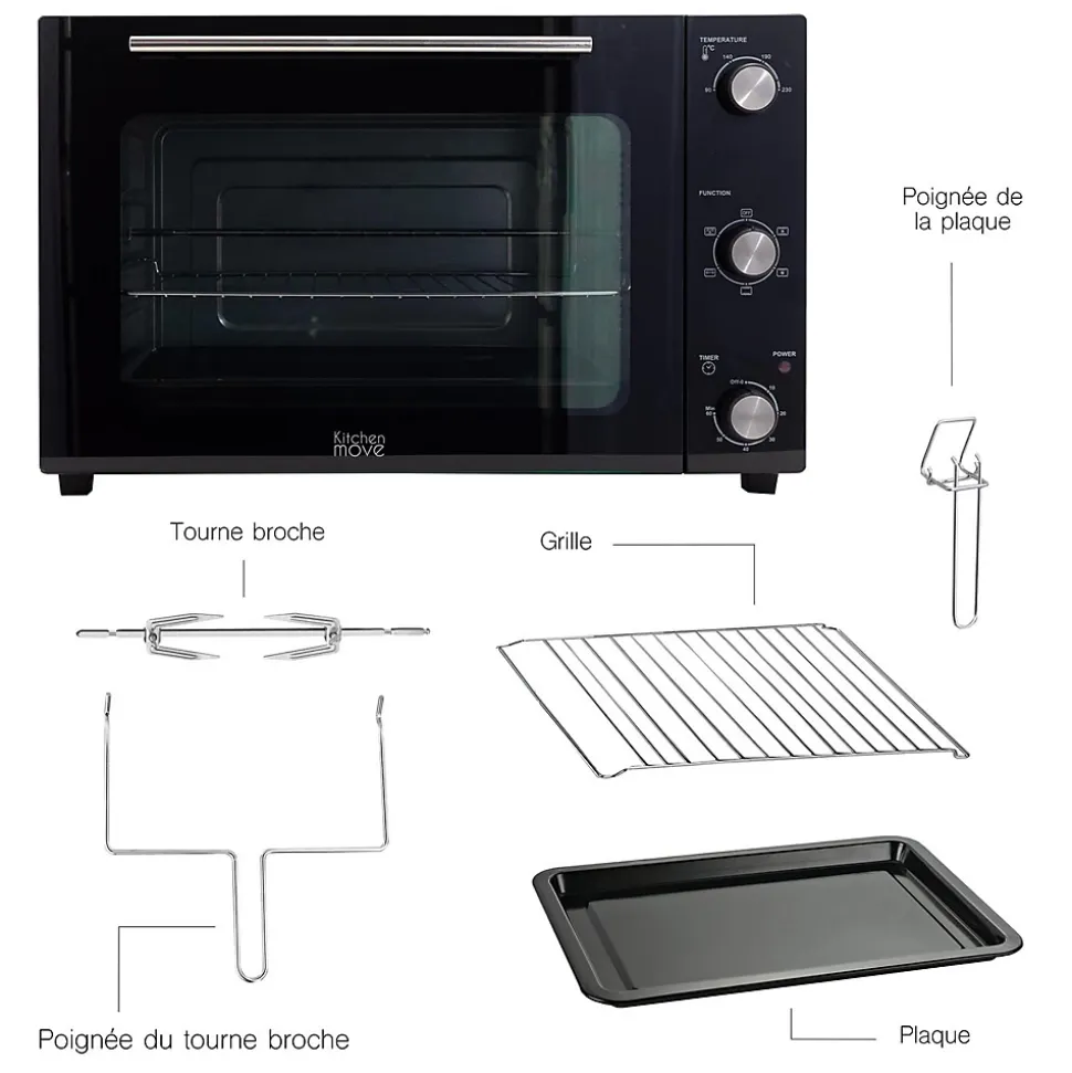 Four multifonction chaleur tournante 58l 2000w noir Kitchen Move – Four multifonction 58L chaleur tournante tournebroche grill 2000w ARIZONA noir 5 programmes de cuisson avec minuterie et accessoiresLe four électrique offre différents modes de cuisson : convection naturelle (chauffe de façon verticale) et chaleur tournante (un ventilateur répartit uniformément la chaleur à l’intérieur du four pour une répartition homogène et rapide de la chaleur).Vous pourrez également sélectionner la fonction grill pour faire gratiner vos plats et la fonction rôtissoire pour de jolis poulets rôtis ! (livré avec le tournebroche spécial rôtisserie).Grâce à ce four, vous pouvez cuisiner tous les types de recettes que vous souhaitez : entrées, viandes, poissons, frites, petits pains précuits, gâteaux, pizzas, gratins, desserts, quiches, saucisses, côtelettes.. – Four posablePuissance : 2000 WCapacité : 58 LThermostat réglable de 100 à 230 °CMinuteur de 0 à 60 minutes avec arrêt automatique et sonnerie en fin de cuissonPorte double vitrage haute résistanceCavité anti-adhésive pour un nettoyage aiséPoignée et boutons rotatifs en acier inoxydable4 pieds anti-dérapants pour un support plus stableAccessoires : grille, lèchefrite, tournebroche et poignées (1 poignée pour le tournebroche et 1 poignée pour la plaque/lèchefrite)Dimensions : 60 x 47 x H39 cmPoids : 13.3 kg