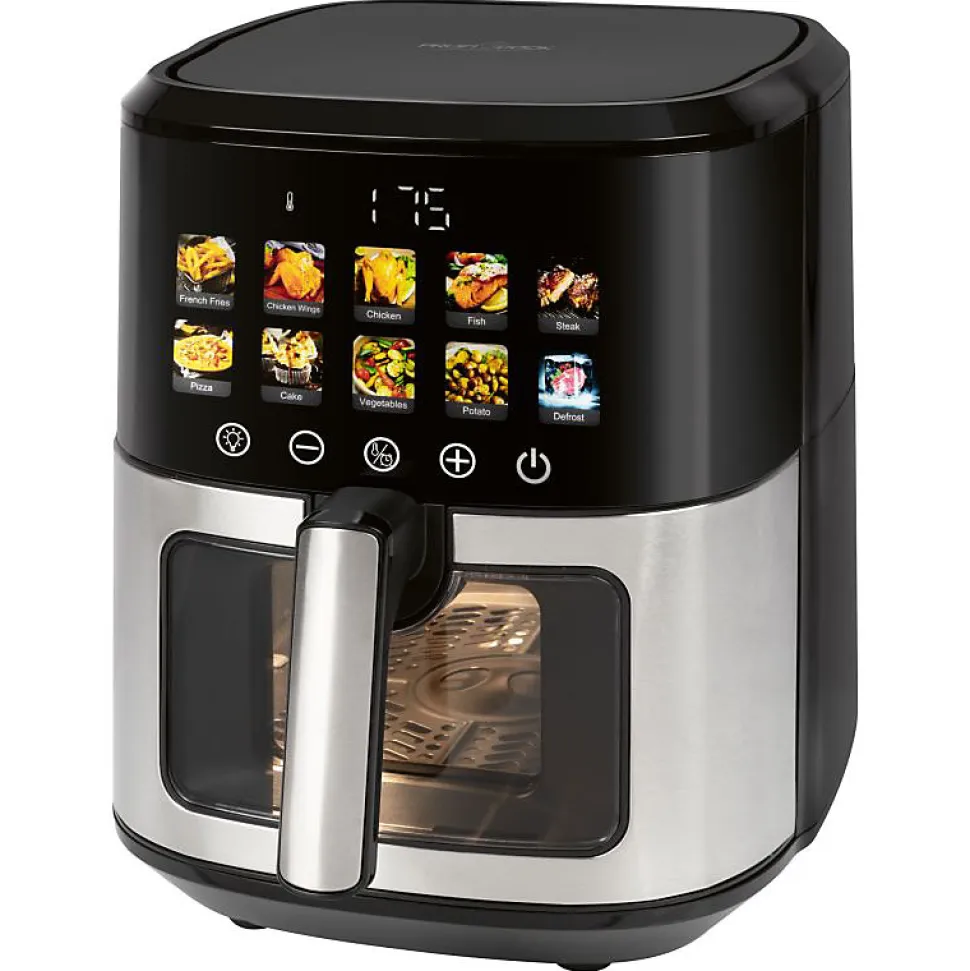 Capacité : environ 6,5 litresFriteuse à air chaud sans huile ni graisseFaçade en acier inoxydableProgrammes/fonctions :- 9 programmes automatiques- fonction variable de dégivrage et de maintien au chaud- réglage individuel de la durée et de la températureFaible émission de fumées et d’odeursGain de temps et d’énergie : jusqu’à 40 % plus rapide et 70 % plus économe en énergie par rapport à un four de classe énergétique A*.Poignée froideAffichage graphique multicolore avec sélection facile et touche sensitiveFenêtre de visualisation à isolation thermique incluseEspace de cuisson éclairéRécipient à revêtement antiadhésifThermostat réglable en continu (50°C-200°C)Arrêt automatiqueProtection contre la surchauffe220-240 V, 50-60 Hz, 1700 W