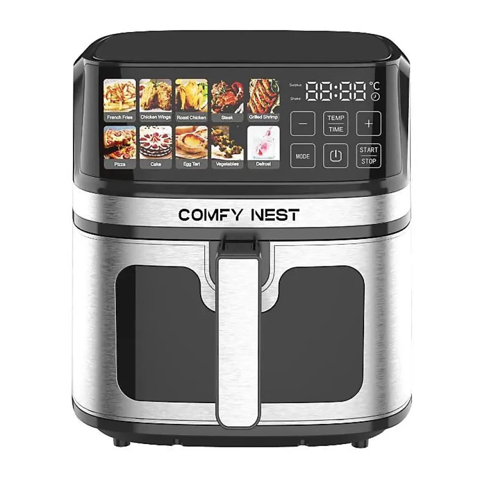 La friteuse à air numérique Comfy Nest CN06160 de 1 700 W est un appareil de cuisine haute performance conçu pour révolutionner votre façon de cuisiner. Dotée d’un puissant moteur de 1 700 W et d’une capacité spacieuse de 8 litres, cette friteuse à air est parfaite pour préparer des portions familiales de vos plats préférés. Dotée de la technologie Rapid Air, elle garantit que vos aliments sont cuits uniformément avec peu ou pas d’huile, permettant une expérience de cuisson plus saine mais savoureuse. Que vous fassiez frire, rôtir ou griller, cette friteuse à air polyvalente facilite la création de délicieux repas avec un minimum d’effort.Cette friteuse à air offre un affichage numérique pour une navigation fluide dans ses programmes de cuisson prédéfinis. Que vous prépariez des frites, des ailes de poulet, du poulet rôti, du steak, des légumes, des crevettes grillées ou même des desserts comme des gâteaux ou des tartes aux œufs, les options prédéfinies vous permettent d’obtenir des plats parfaitement cuits en appuyant sur un bouton et disposent même d’une fonction de décongélation. Le contrôle de température réglable (80°C à 200°C) et une minuterie de 0 à 60 minutes offrent une flexibilité pour une large gamme de recettes, ce qui en fait un incontournable pour toute cuisine. De plus, la fenêtre de visualisation vous permet de surveiller le processus de cuisson sans l’interrompre, garantissant des résultats précis à chaque fois.Pour plus de commodité, le Comfy Nest CN-06160 est conçu dans un souci de sécurité et de convivialité. Il comprend une protection contre la surchauffe et une fonction d’arrêt automatique pour éviter la surchauffe et garantir une utilisation sûre. Les surfaces antiadhésives facilitent le nettoyage et le panier est facile à retirer pour servir. Son design élégant et ses performances puissantes en font un excellent choix pour tous ceux qui cherchent à profiter de repas plus sains sans compromettre le goût ou la comm