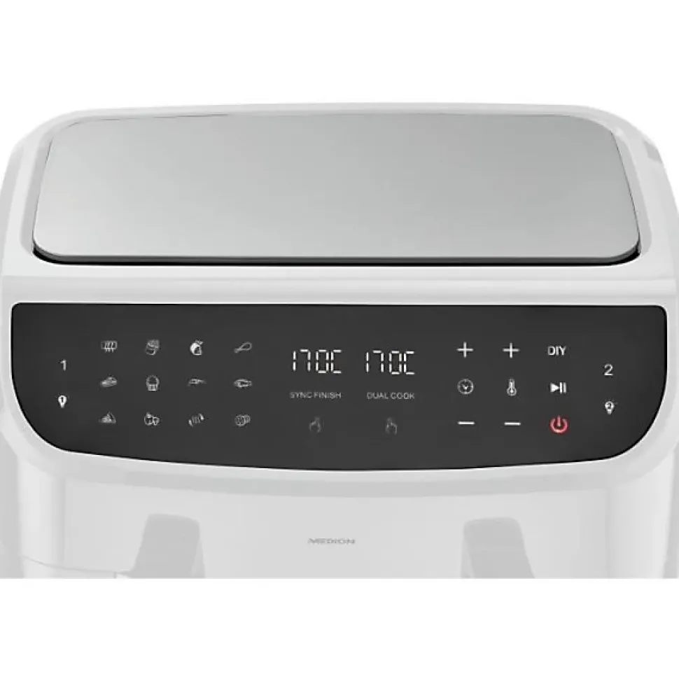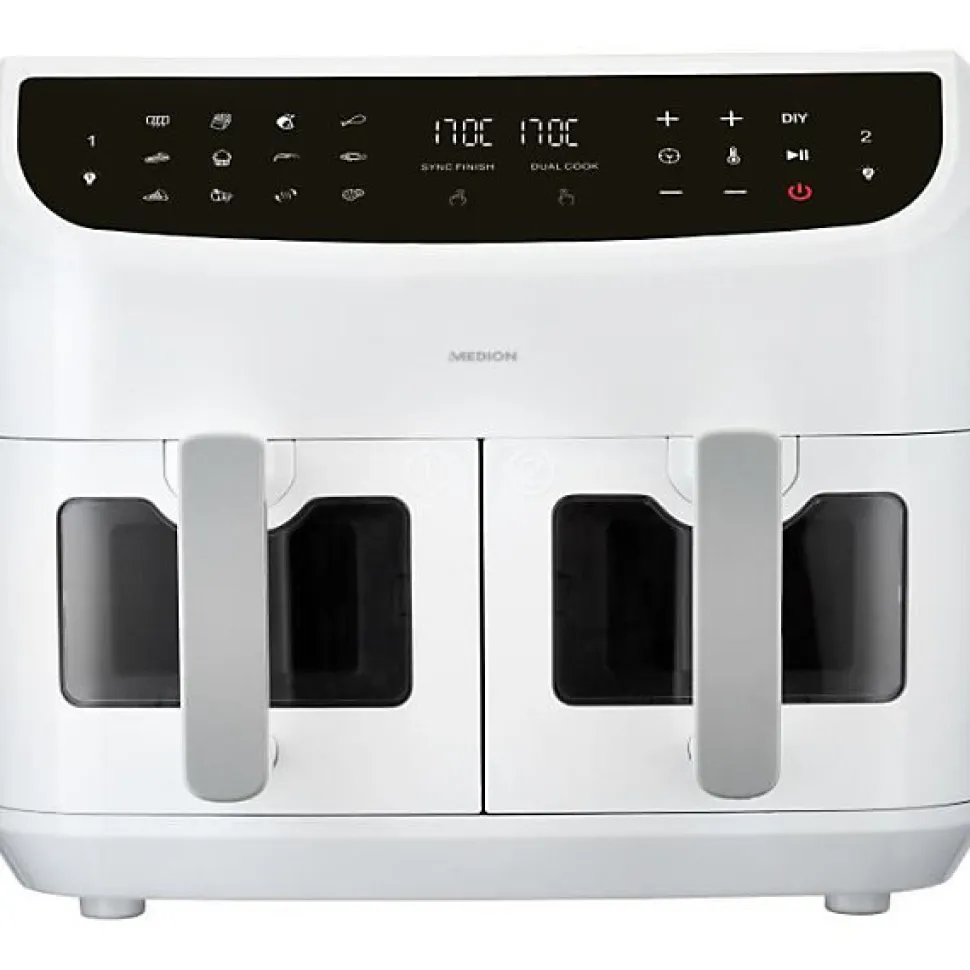 Optez pour une cuisson saine avec la friteuse à air chaud MEDION P20 XXL Twin. Avec ses 2 paniers de 4,35 L chacun, vous pouvez préparer des repas pour toute la famille en un seul coup. Ses 9 programmes et sa puissance de 2600 W assurent une cuisson rapide et homogène. L’écran tactile intuitif et la fonction de synchronisation offrent un confort optimal de cuisson.