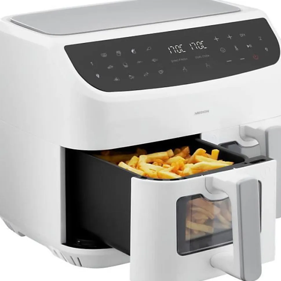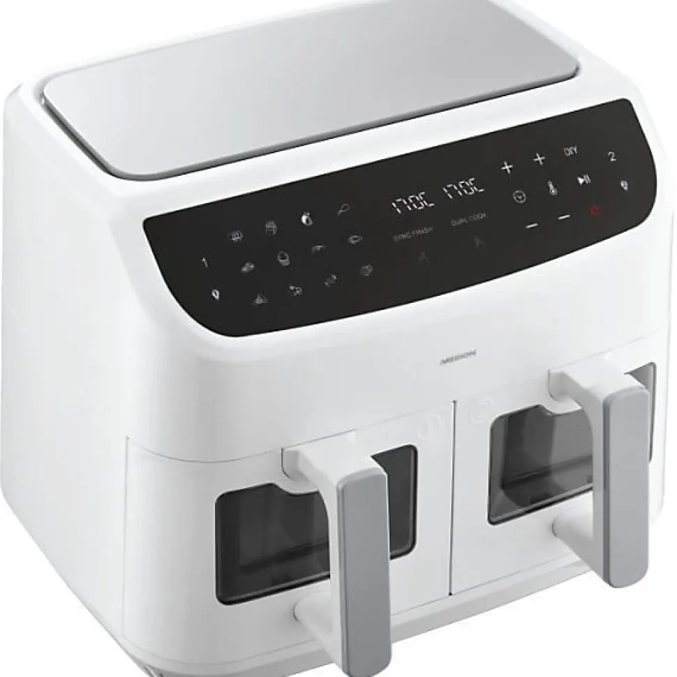 Optez pour une cuisson saine avec la friteuse a air chaud MEDION P20 XXL Twin. Avec ses 2 paniers de 4,35 L chacun, vous pouvez préparer des repas pour toute la famille en un seul coup. Ses 9 programmes et sa puissance de 2400 W assurent une cuisson rapide et homogene. De plus, l’application Life+ propose 100 recettes pour inspirer vos repas.