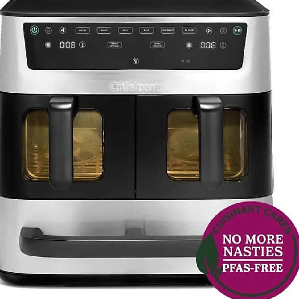 Cuisinart Trizone AFT13XSSE : airfryer 3 zones indépendantes (2 paniers 4,3 L + tiroir 5 L) pour cuire plusieurs plats simultanément, 13,6 L, 2400 W, revêtement céramique sans PFAS, panneau tactile, modes programmés (Pizza, Toast, Manuel) et nettoyage facile.