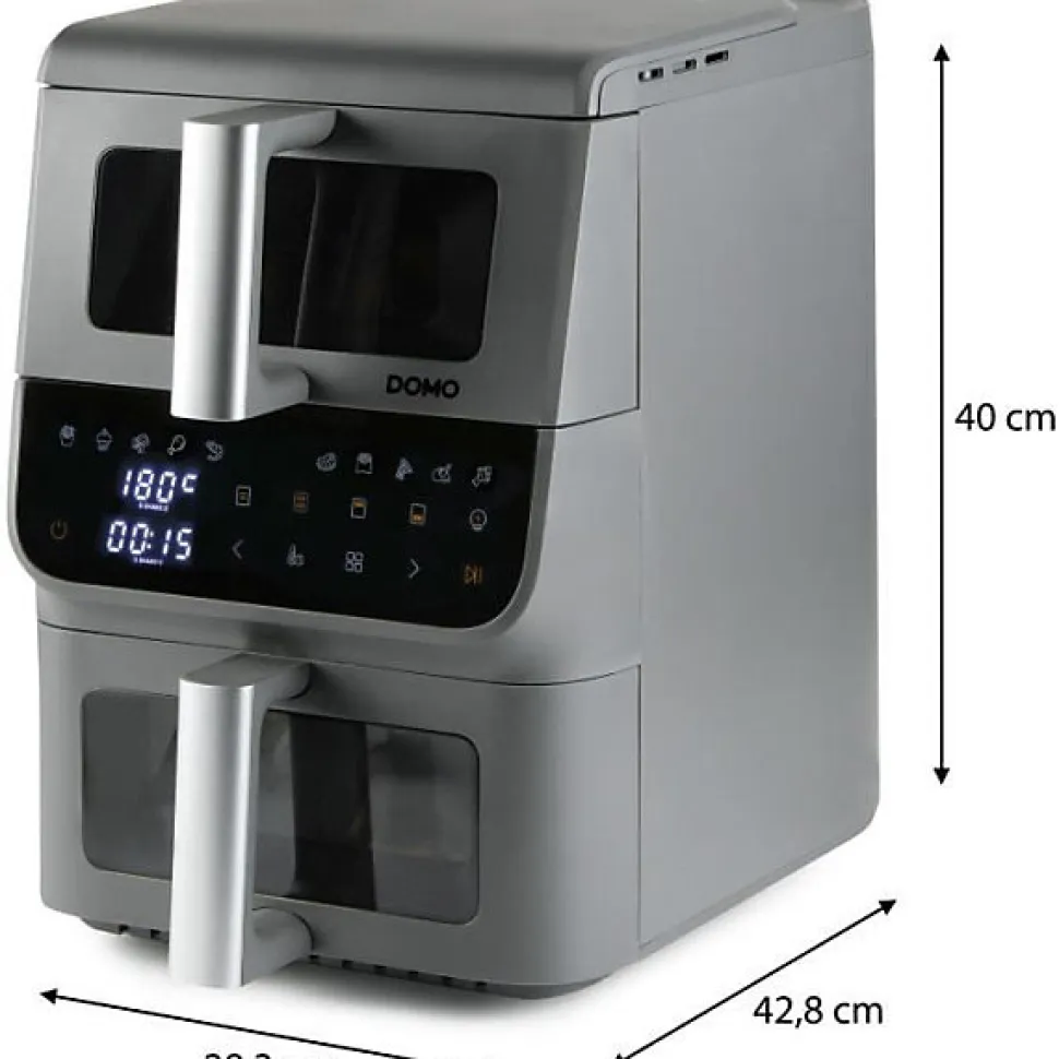 Friteuse sans huile DOMO – Airfryer DO550FR – Design vertical : 2 tiroirs empilés, économise 30 % d’espace – Capacité 10 L – Double cuve 3.5 L + 6,5 L – 10 programmes de cuisson – 2500 W – Tiroirs réglables indépendamment pour une cuisson simultanée – Température réglable de 80°C a 200°C – Minuteur jusqu’a 60 minutes – Écran LED avec commande tactile : réglage numérique du temps et de la température – Paniers et grilles avec revetement antiadhésif sans PFAS – Hublots de contrôle pour vérifier la cuisson.