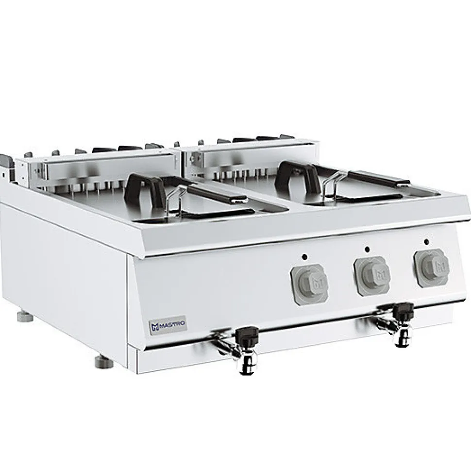Friteuse Professionnelle électrique de table 2x 10 litres Bac doubleGrillade cheminée en fonte émaillée inrayable.de tableContrôle de la température par thermostat. Paniers en acier inoxydableTempérature réglableBrûleurs tubulaires en acier inoxydableFacile à nettoyer grâce aux éléments chauffants mobilesThermostat de sécurité (190°C) pour éviter la surchauffe de l’huile