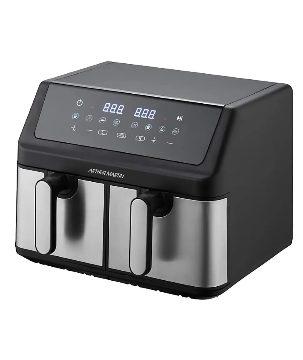 AMPF9 Air Fryer Double ARTHUR MARTIN – Friteuse sans huile – Puissance : 2000W – Capacité : 2x 4.5L soit total 9L – Minuterie : 60min – contrôle de température 80° a 200° – Pied antidérapant – Multifonction : Rôtir – réchauffer – Déshydrater – Cuire – Décongeler – Affichage LED