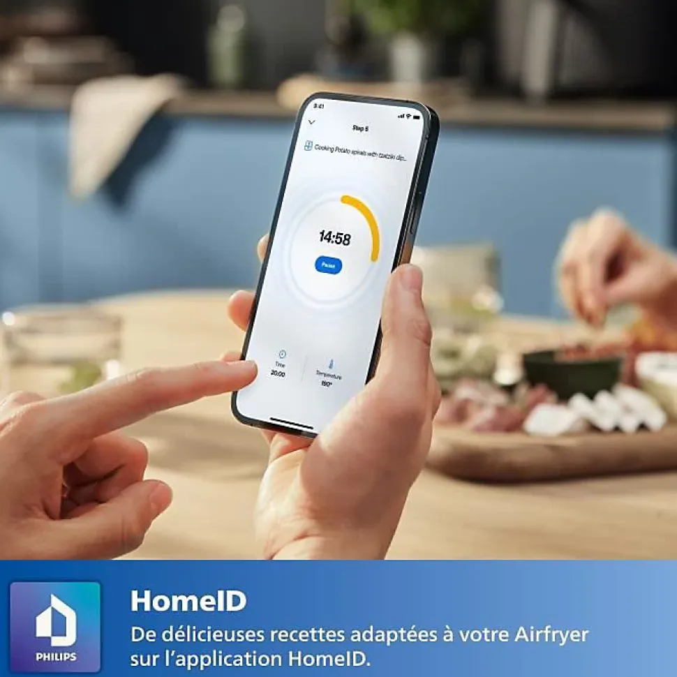 Doté d’une capacité de 4,2L, cet Airfryer Philips est idéal pour la cuisine du quotidien. 12 modes de cuisson différents, que ce soit pour cuire, griller ou déshydrater. Réglez facilement le temps et la température selon vos besoins, que vous souhaitiez réchauffer, décongeler ou maintenir au chaud. Avec sa puissance de 1500W vous pourrez faire cuire les ingrédients de votre choix. Le minuteur intégré de votre friteuse sans huile vous permet de prérégler les temps de cuisson jusqu’à 60 minutes, avec un son d’alerte pour signaler la fin de la cuisson. Un thermostat entièrement réglable vous aide à choisir la température idéale, jusqu’à 200 degrés. Préparez des frites, des en-cas ou des plats principaux croustillants, tous cuits à la température parfaite ! Dites adieu aux remords ! Préparez des plats délicieux avec jusqu’à 90 % de matières grasses en moins, presque sans huile. Vous pouvez ainsi savourer des repas sains sans faire de compromis sur le goût. Grâce à la technologie brevetée Rapid Air et à sa conception fond en étoile, l’air chaud circule autour des aliments de manière homogène, garantissant une cuisson croustillante à l’extérieur et tendre à l’intérieur, avec pas ou très peu d’huile ajoutée. Accédez à l’application HomeID pour explorer des centaines de recettes délicieuses, saines et rapides à préparer. Chaque recette est sélectionnée par des experts en nutrition pour vous aider à cuisiner au quotidien. Encore mieux, l’application se base sur vos habitudes de consommation et votre modèle d’air fryer. Un entretien facile, tous les composants amovibles passent au lave-vaisselle, et le panier QuickClean est doté d’un revêtement anti-adhésif, rendant le nettoyage rapide et simple.