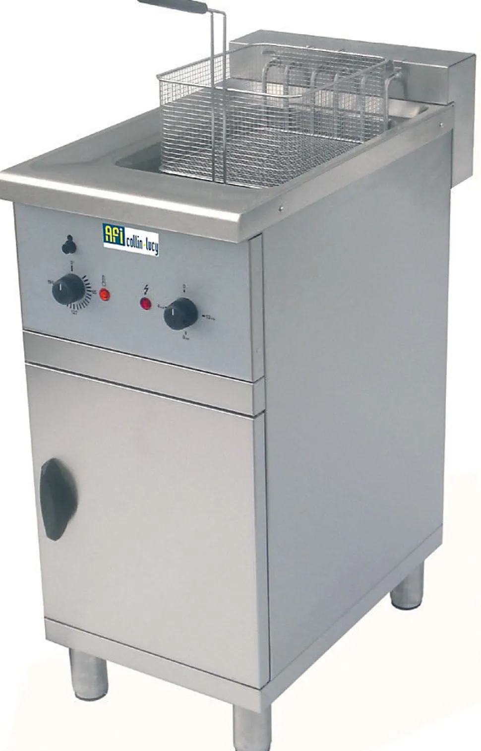 AFI Collin-Lucy friteuse Friteuse électrique sur meuble multi-puissance adaptée pour la cuisson de produits surgelés. Construction tout en inox et pieds en inox réglables en hauteur. Cette friteuse sur meuble professionnelle est équipée d’un cuve d’une capacité de 16 litres totalement emboutie avec zone anti-débordement. Un commutateur 3 positions permet d’adapter la puissance selon les besoins : 4 kW (maintient la température de l’huile), 8 kW (cuisson d’aliments frais) et 12 kW ( montée rapide en température et cuisson d’aliments surgelés).