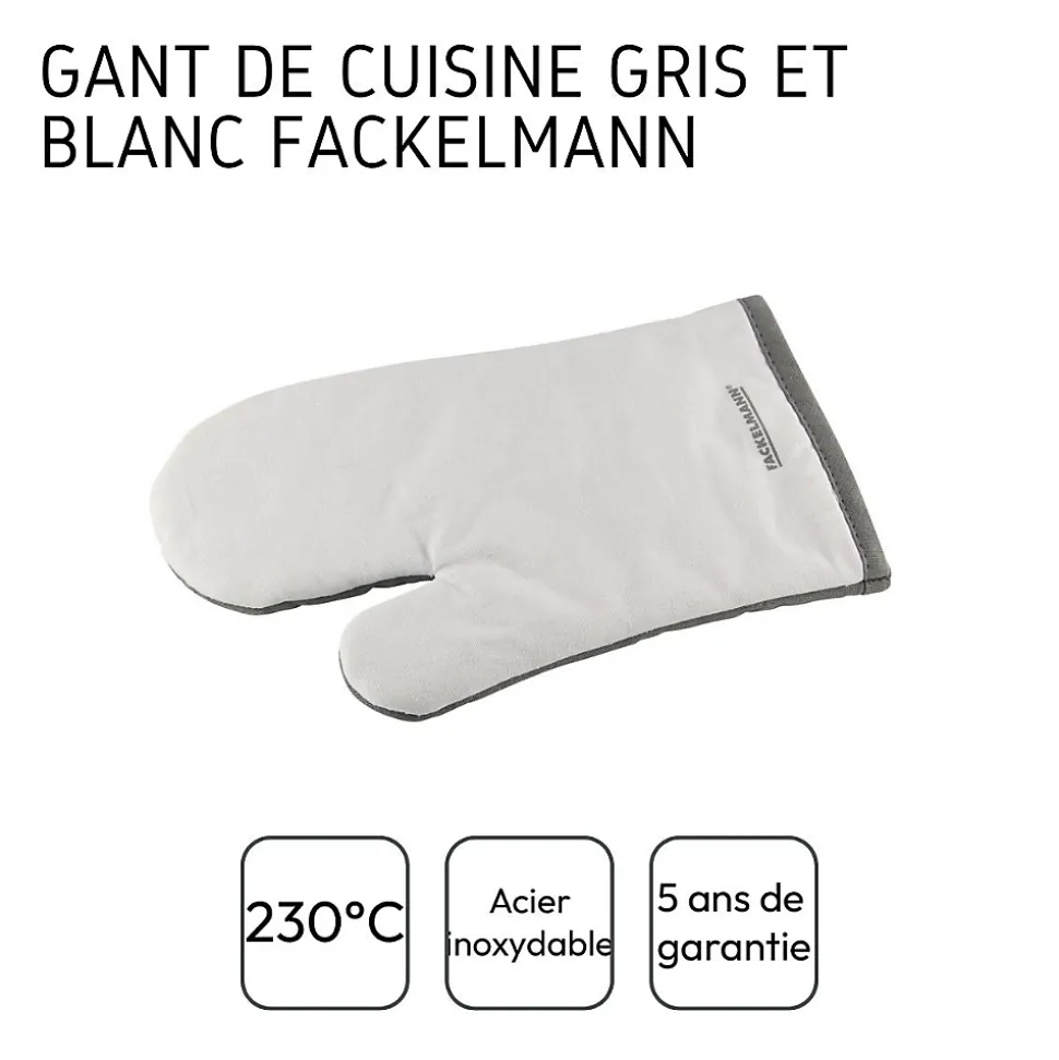 - DESCRIPTION : Fackelmann vous propose ce gant de cuisine gris et blanc. Ce gant vous protège de la chaleur jusqu’à 250°C pendant une durée d’environ 15 secondes.