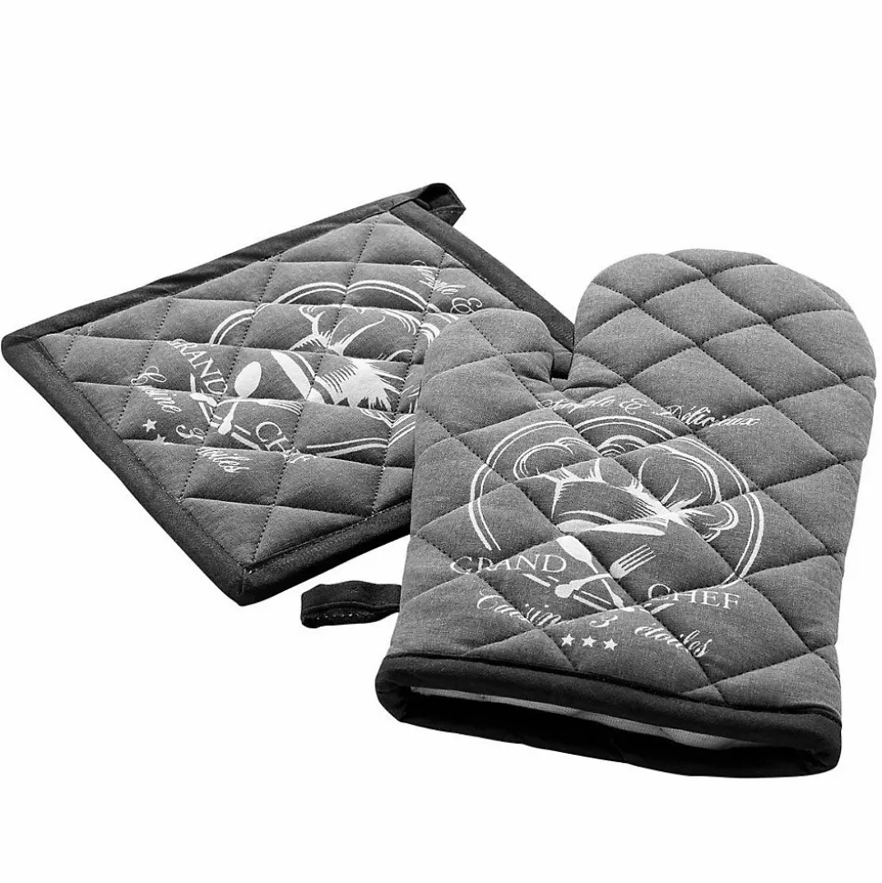 Informations Techniques :Dimensions : Gant : L. 28 x l. 18 cmManique : L. 20 x l. 20 cmMatières : Extérieur : 100% Coton Interieur : 100% PolyesterSpécificités :Pratique & UtileGant & maniqueInscription « Grand Chef »Label Oeko-TexEntretien : Lavage à 40°Pas de séchage en machineRepassage à 150°Poids : 0,11 kgCouleur : Gris