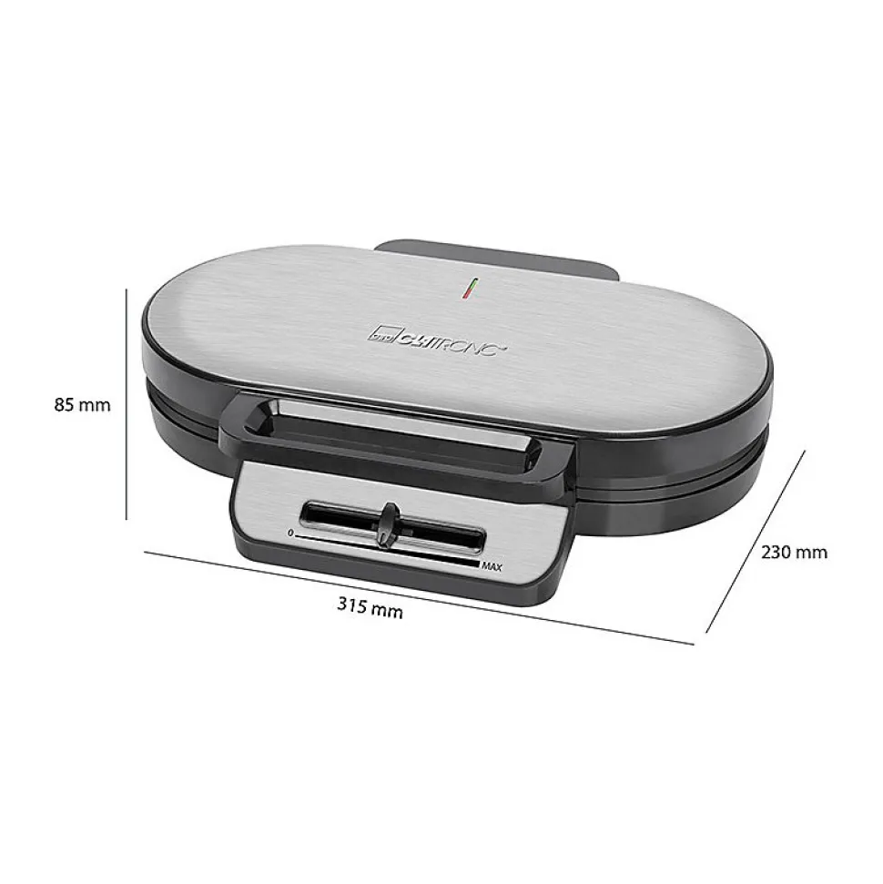 Insert et couvercle en acier inoxydablePréparation en quelques minutes2 surfaces de cuisson (revêtement anti-adhésif)2 gaufres pour chaque cuissonPoignée isolée de la chaleurNiveau de brunissage réglable en continu2 témoins lumineux pour l’alimentation et le chauffage (témoins de cuisson)Support sûr grâce aux pieds caoutchoutésProtection contre la surchauffeRangement du cordon220-240 V, 50/60 Hz, 1200 W