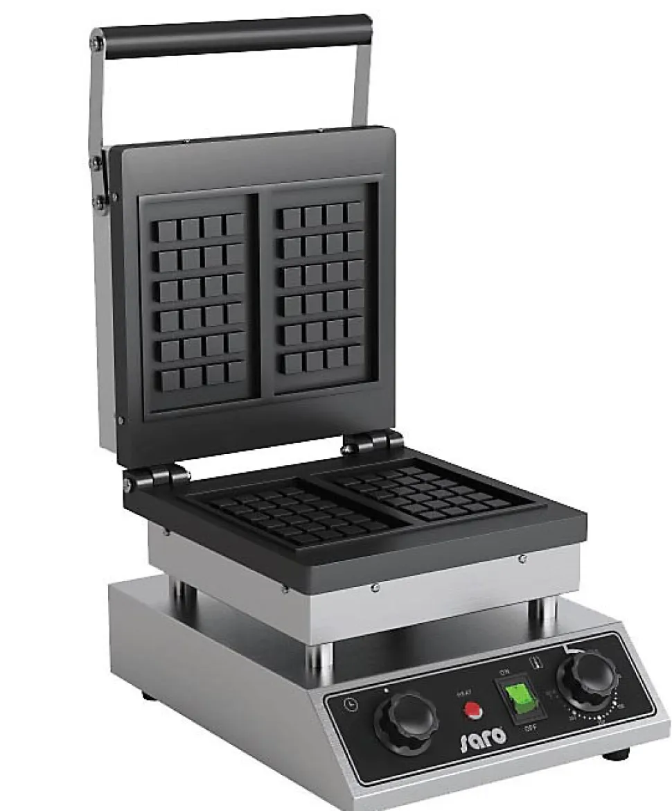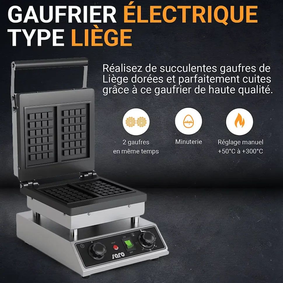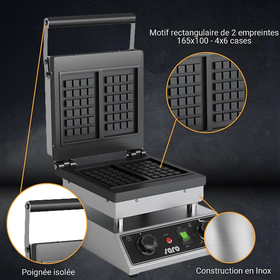 Gaufrier Professionnel Double Type Liège avec minuteur. Gaufres de liége motif rectangulaire de 2 empreintes 165x 100mm 4×6 cases.Construction inox Plaques de cuisson en fonte antiadhésive Poignée isolée Avec minuterie Réglage manuel de temperature de +50°C à +300°CDimensions 300x380x270mmTension : 230 mono kw : 1.6