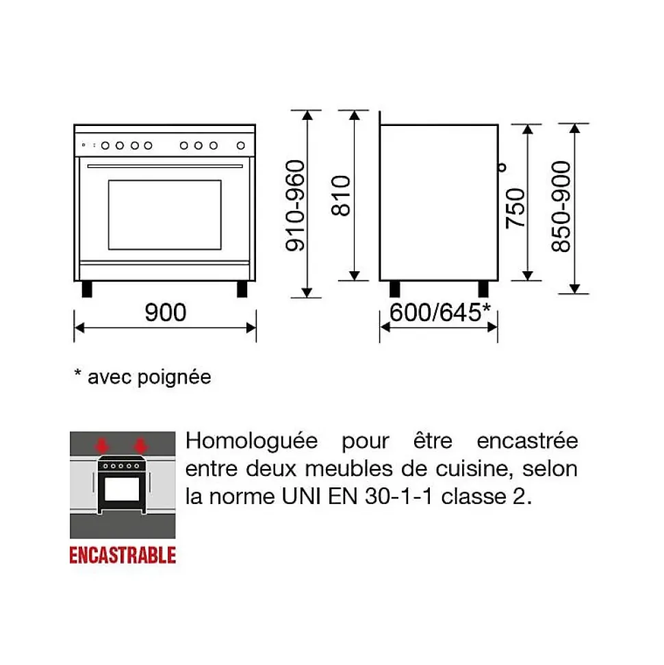 Description piano de cuisson 90 cm gaz GLEM GE960CMIX2 :Piano de cuisson – Four gaz – 3 modes de cuisson dont Gril + tournebroche – Gril électrique 2 kW – Minuteur sonore 60 minutes – Allumage électronique »bouton » – Eclairage – Panneaux catalytiques autonettoyants – Gradins fils – Contre-porte plein verre avec verre démontable – Porte 2 vitres – Tournebroche – Allumage de la table électronique »bouton »- 5 brûleurs dont 1 triple couronne 3,8 kW – Sécurité gaz par thermocouple – Grilles fonte – Départ de crédence – Coffre de rangement chauffe-plat – Plinthes cache-pieds noires de série – Ventilateur tangentiel aspiré : l’air chaud du four est rejeté sur l’arrière, pas de souffle d’air en façade – Homologué pour être encastré entre deux meubles de cuisine, selon la norme UNI EN 30-1-1 classe 2 – Finition inox.Code EAN : 8054383965052Caractéristiques piano de cuisson 90 cm gaz GLEM GE960CMIX2 :Volume du four : 109 LEnergie four : gazType de cuisson : Convection naturelleChaleur tournante : nonNettoyage four : CatalyseProgrammateur : sans (Minuterie simple)Préconisation température : nonPuissance gril : 2000 WattsOuverture porte : abattantePorte froide : nonEclairage intérieur : ouiTournebroche : ouiEquipement : 1 grille + 1 lèchefriteTable de cuisson : 5 feux gazFoyer(s) gauche : AV -/3 _ AR -/1,75 cm/kWFoyer(s) droit : AV -/1 _ AR -/1,75 cm/kWFoyer(s) central : triple couronne 3,8 kW cm/kWAllumage table : électroniqueSécurité gaz : par thermocoupleInjecteurs : Equipé pour le gaz naturel – Livrée avec injecteurs butane/propaneGrilles : fonteLabels piano de cuisson 90 cm gaz GLEM GE960CMIX2 :Label énergie. : ALe + produit : four gaz 109 LCordon électrique : fourni (120 cm) sans priseColoris : inoxDimensions (LxHxP) : 90 x 91/96 x 60 cmPoids net : 67 KgLieu de fabrication : Italie