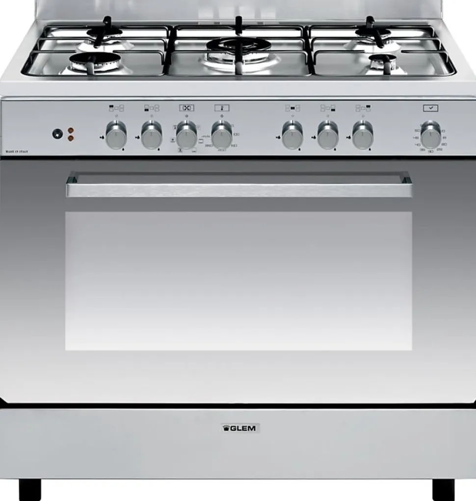 Cuisinière e-Cooker GLEM GE960CBIX2, piano de cuisson inox 90 x 60 cm, 5 foyers gaz avec allumage électronique et sécurité thermocouple, four électrique multifonction 104L avec 6 modes de cuisson dont chaleur brassée, panneaux catalytiques autonettoyants, minuteur de 60 minutes, coffre chauffe-plat.