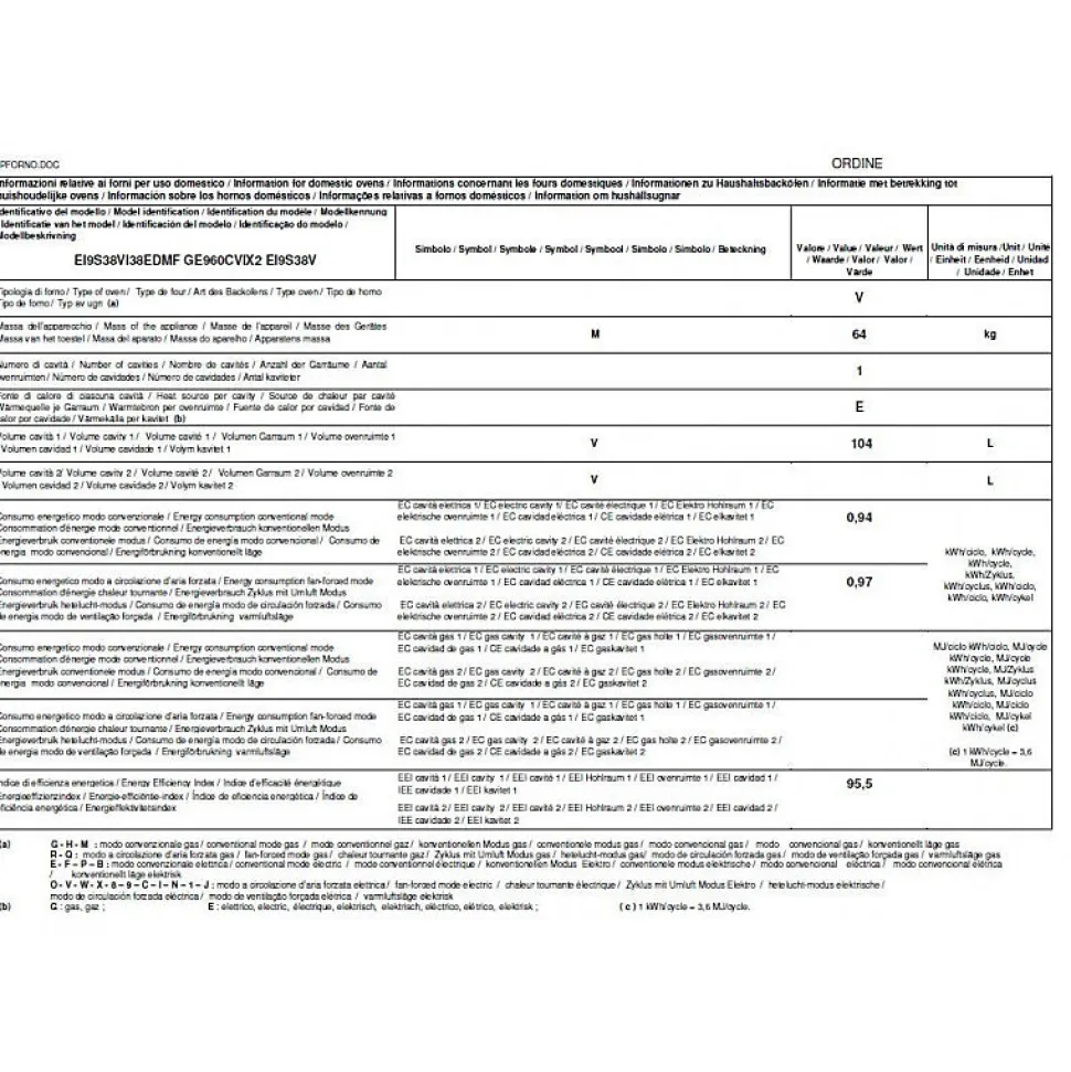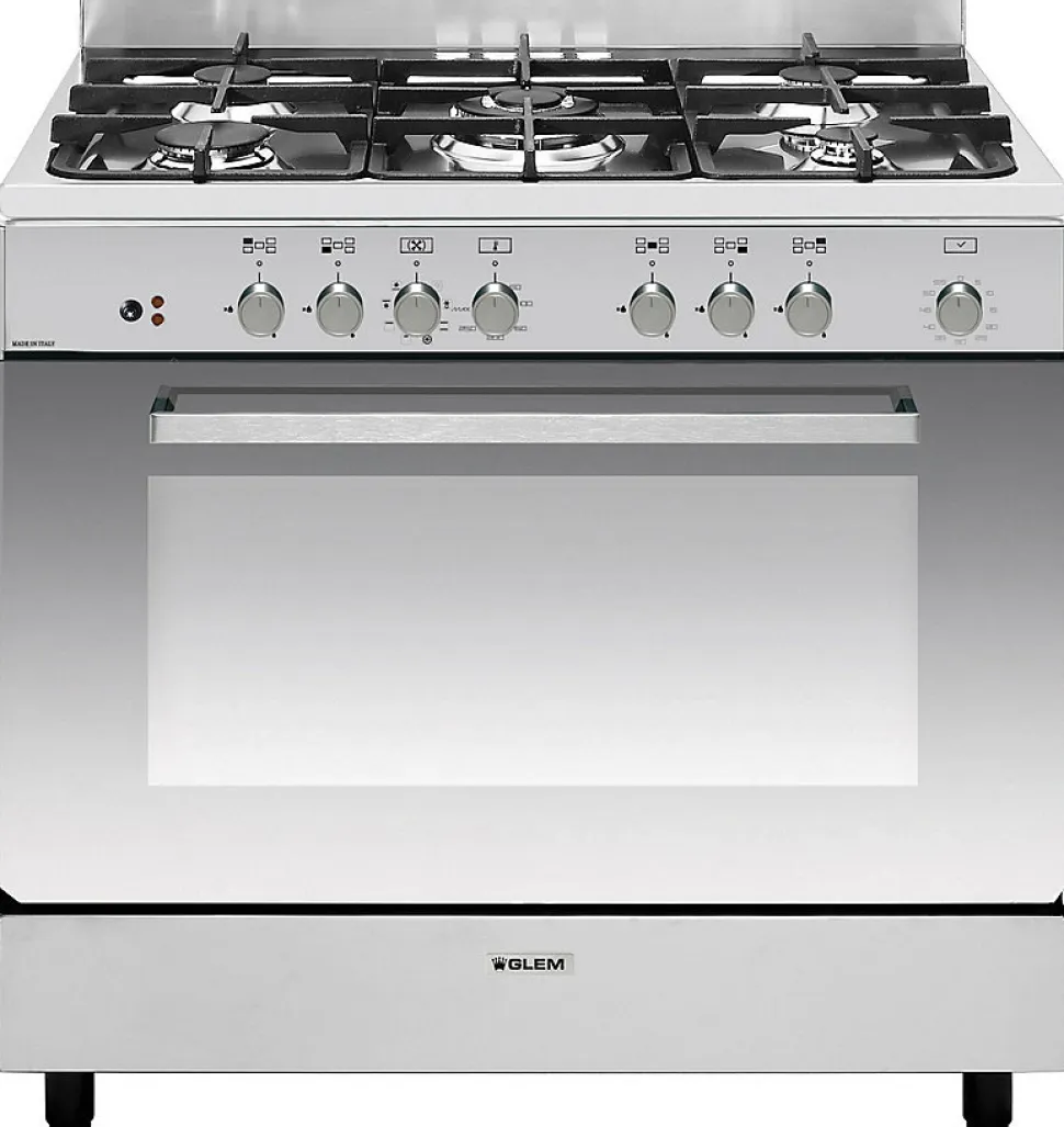 Description piano de cuisson mixte GLEM GE960CVIX2 :Piano de cuisson – Four électrique – 7 modes de cuisson dont Maxi Gril pulsé et Chaleur tournante – Minuteur sonore 60 minutes – Eclairage – Panneaux catalytiques autonettoyants – Gradins fils – Contre-porte plein verre avec verre démontable – Porte 2 vitres – Allumage de la table électronique »bouton » – 5 brûleurs dont 1 triple couronne 3,8 kW – Sécurité gaz par thermocouple – Grilles fonte – Départ de crédence – Coffre de rangement chauffe-plat – Plinthes cache-pieds noires de série – Ventilateur tangentiel aspiré : l’air chaud du four est rejeté sur l’arrière, pas de souffle d’air en façade – Homologué pour être encastré entre deux meubles de cuisine, selon la norme UNI EN 30-1-1 classe 2 – Finition inox.Code EAN : 8054383965038Caractéristiques piano de cuisson mixte GLEM GE960CVIX2 :Volume du four : 104 LEnergie four : électriqueType de cuisson : MultifonctionChaleur tournante : ouiNettoyage four : CatalyseProgrammateur : sans (Minuterie simple)Préconisation température : nonPuissance gril : 2450 WattsOuverture porte : abattantePorte froide : nonEclairage intérieur : ouiTournebroche : sansEquipement : 2 grilles + 1 lèchefriteTable de cuisson : 5 feux gazFoyer(s) gauche : AV -/3 _ AR -/1,75 cm/kWFoyer(s) droit : AV -/1 _ AR -/1,75 cm/kWFoyer(s) central : Triple couronne 3,8 kW cm/kWAllumage table : électroniqueSécurité gaz : par thermocoupleInjecteurs : Equipé pour le gaz naturel – Livrée avec injecteurs butane/propaneGrilles : fonteLabels piano de cuisson inox mixte GLEM GE960CVIX2 :Label énergie. : ALe + produit : Chaleur tournanteCordon électrique : fourni (120 cm) sans priseColoris : inoxDimensions (LxHxP) : 90 x 91/96 x 60 cmPoids net : 67 KgLieu de fabrication : Italie