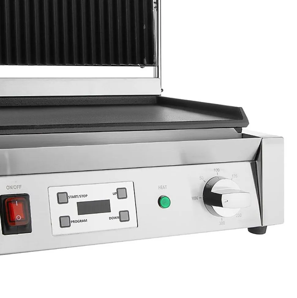 Donnez de l’énergie à votre cuisine avec les grils de contact extra-larges Buffalo. Conçus pour être utilisés dans des cuisines au rythme soutenu, ces grils offrent une zone de cuisson spacieuse et des commandes de chaleur réglables, garantissant que de grandes quantités d’aliments puissent être grillées avec précision. Les matériaux résistants offrent une excellente durabilité. Dimensions: 200(H) x 430(L) x 310(P) mmMatériel: InoxAlimentation: 220-240VPoids: 19,3 kgPrise: OuiMinuterie numérique avec 4 réglages de programmes pour une cuisson cohérentePlaques de gril en fonte émaillée lourde et durablePlateau de récupération de graisse amovible – facile à nettoyer sans déplacer le grilPlaque supérieure équilibrée – positionner la plaque au-dessus des aliments sans effortPlage de température 50-300°CLa fonte émaillée est facile à nettoyer et à entretenir