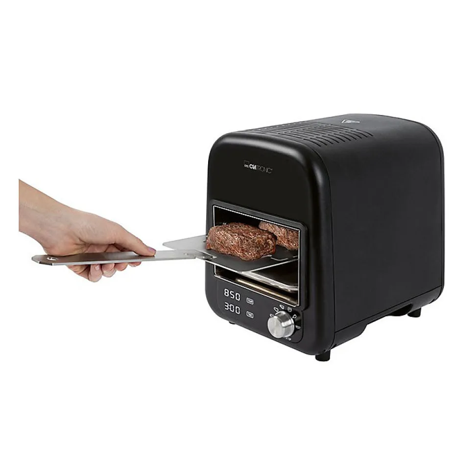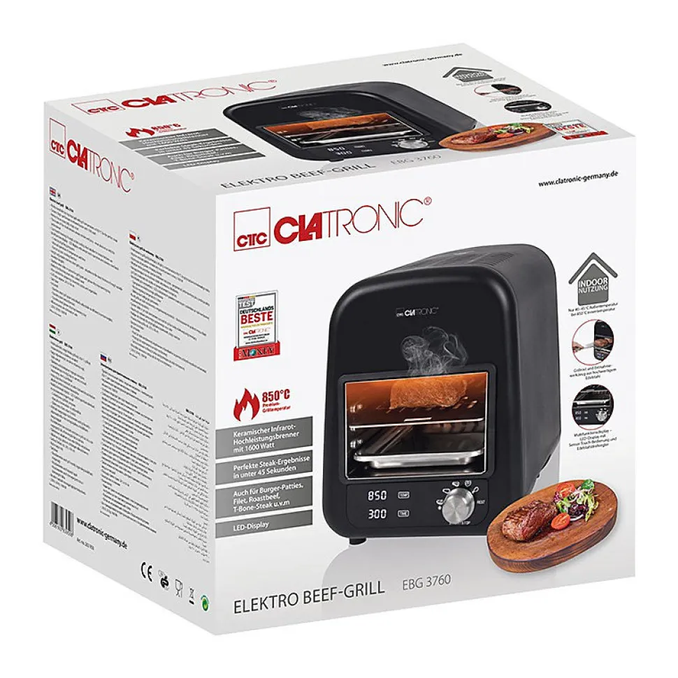 Gril électrique professionnel à chaleur supérieure avec des températures de gril de 850 °C pour un steak parfaitBrûleur infrarouge céramique haute performance de 1600 wattsParfait pour une croûte particulièrement croustillanteL’intérieur du steak reste toujours tendre et juteux – le plaisir de la viande comme avec le professionnel.Boîtier Cool touch ; grâce au refroidissement actif, idéal pour une utilisation en intérieur/cuisineÉcran multifonctions – écran LED avec commande tactile et bouton en acier inoxydable- 5 programmes de grillades électriques- Commande manuelle de la température et de la durée- Fonction de post-cuisson électriqueGrille de grillage en acier inoxydable réglable en hauteur – adaptation à l’épaisseur de la viande grâce auxhauteur d’insertion variableSystème de glissière en acier inoxydable pour la grille de grillage et le plateau de récupération des graisses/plateau chauffant.Parfait pour la finition de la viande cuite sous-videConvient également à la préparation de plats en cocotte, de pizzas et de légumes.Surface de gril : environ 24,5 x 16 cmSupport sécuriséInclus :- Grille de gril en acier inoxydable (réglable individuellement par différentes hauteurs d’insertion)hauteurs d’insertion)- Outil d’extraction en acier inoxydable- Bac de récupération des graisses/plateau chauffant en acier inoxydableTous les accessoires sont compatibles avec le lave-vaisselle230 V, 50 Hz, 1600 W