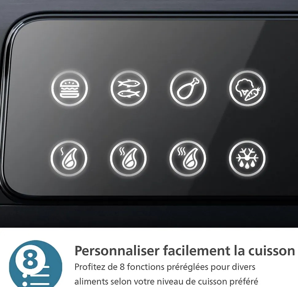 Profitez d’une cuisson maîtrisée grâce à la sonde de température intégrée qui mesure précisément la température interne de vos aliments pour un résultat parfait selon votre préférence, saignant, à point ou bien cuit. Ses 8 fonctions préréglées simplifient la préparation et garantissent des résultats constants d’une simple pression sur un bouton. Sa puissance de 2000 W assure une montée en température rapide et homogène, idéale pour saisir viandes, poissons et légumes. La grande surface de cuisson permet de préparer plusieurs portions simultanément, parfaite pour les repas en famille. Le contrôle numérique de la température offre un réglage précis pour adapter la cuisson à chaque recette. Le gril s’ouvre à 180° pour se transformer en gril de table et cuire des deux côtés en même temps. Les plaques antiadhésives et le bac récupérateur amovible facilitent le nettoyage pour un entretien rapide et pratique au quotidien.