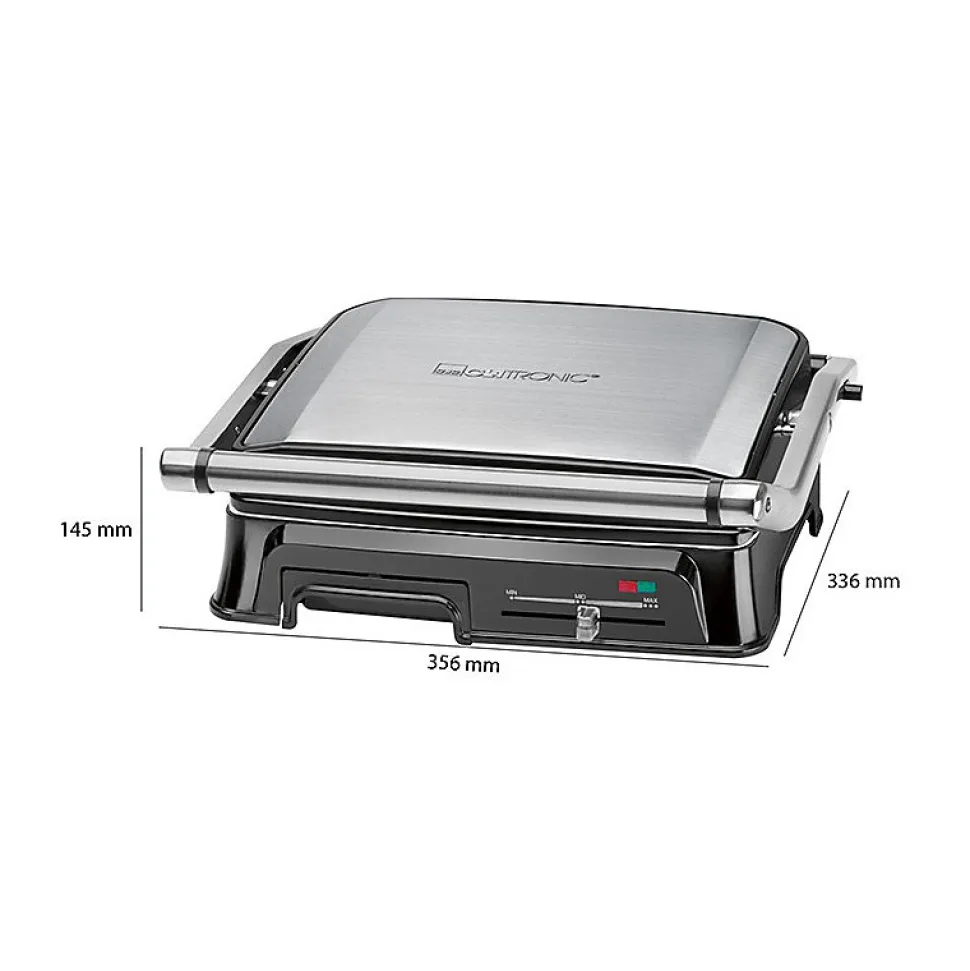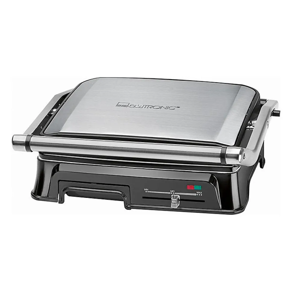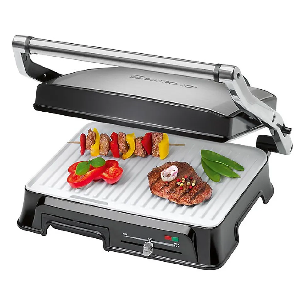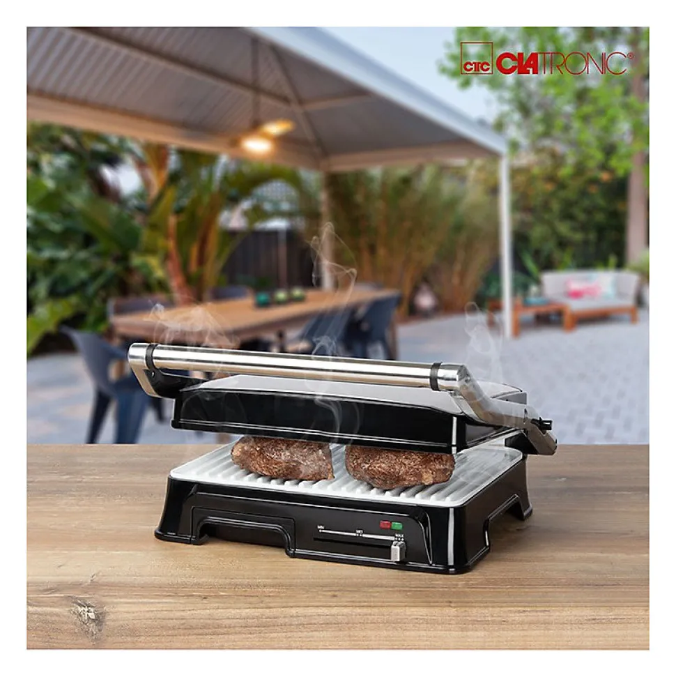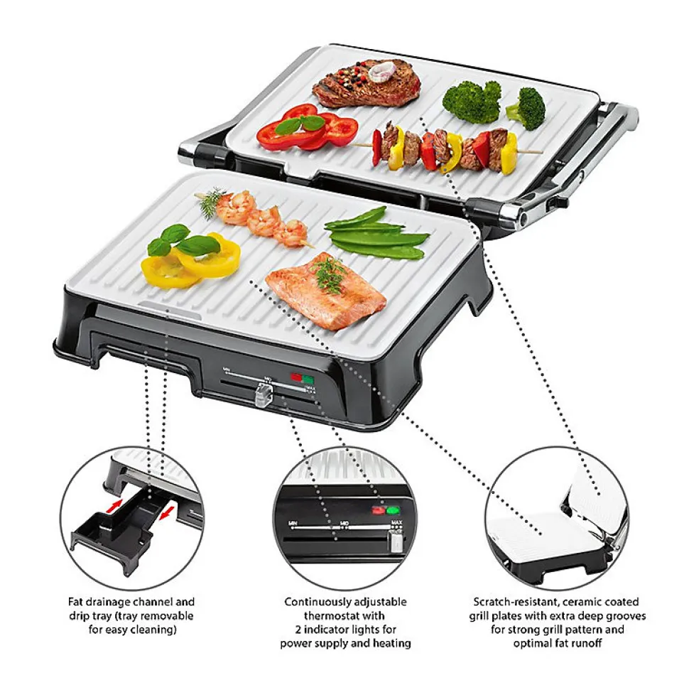 Grille de contact pour une grillade double face, sans graisseGrille de barbecue – l’ouverture à 180° permet de griller sur une grande surfaceCanal d’évacuation des graisses et bac de récupération (bac amovible pour un nettoyage facile)nettoyage facile)2000 wattsBoîtier en acier inoxydableThermostat réglable en continuTemps de cuisson courtsPlaques de gril résistantes aux rayures, à revêtement céramique avec desrainures très profondes pour un grillage puissant et un bon écoulement des graisses.Grande poignée isolée de la chaleur2 témoins lumineux pour l’alimentation et le chauffageAffichage de la température « prêt ».Grandes surfaces de gril : 2x 29,5 x 23,5 cm environRangement du cordonUtilisation polyvalente, par exemple pour les panini, les steaks, le poisson ou les légumes.220-240 V, 50/60 Hz, 2000 W