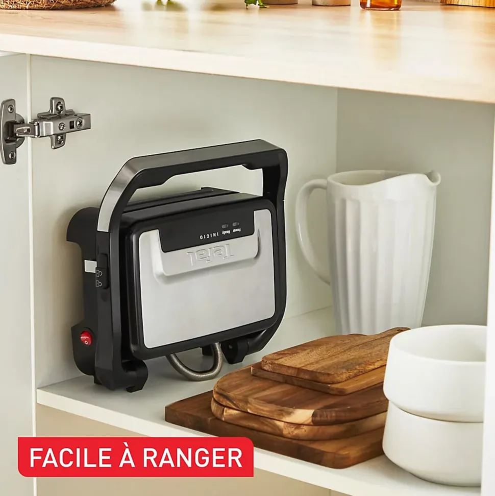 Ce gril panini 2-en-1 noir combine compacité et performance pour préparer facilement paninis, viandes et légumes grillés. Grâce à sa puissance de 1000 W, il chauffe rapidement pour une cuisson homogène et savoureuse. Sa surface de cuisson de 23 x 14,5 cm est idéale pour 1 à 2 personnes, parfaite pour les repas rapides du quotidien. Doté d’un boîtier robuste et de plaques antiadhésives résistantes, il garantit un nettoyage simple et sans effort. Son bac à jus amovible compatible lave-vaisselle facilite encore davantage l’entretien. Pratique à ranger grâce à son format compact, son rangement vertical, son système de verrouillage et son range-cordon intégré, il trouve facilement sa place dans toutes les cuisines.