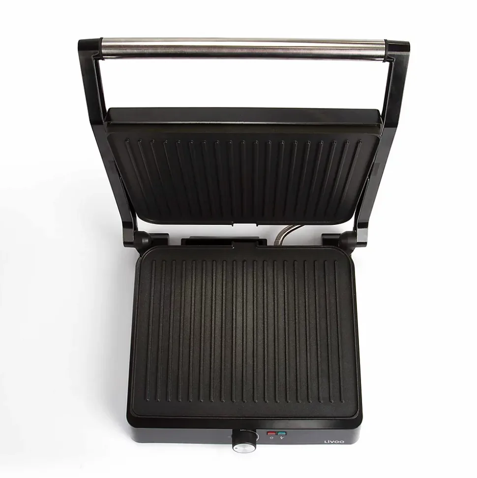 Grill Viande et Panini LIVOO DOC223 2200 W — 2 plaques rainurées antiadhésives, surface 29 x 23 cm (667 cm²), ouverture 180° pour fonction plancha, thermostat réglable jusqu’à 230 °C, récupérateur de graisse amovible, boîtier acier inoxydable et bakélite. Garantie 2 ans.