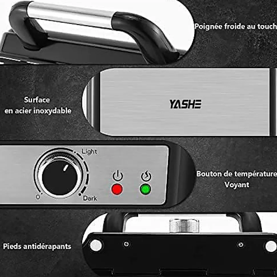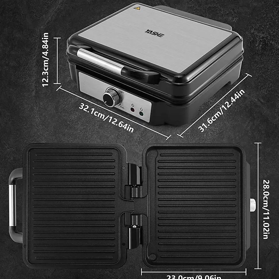 La presse à panini 3-en-1 combine puissance et polyvalence pour une cuisson rapide et homogène. Grâce à son ouverture à 180°, elle se transforme en grand grill électrique avec deux plaques antiadhésives de 28 x 23 cm, idéales pour steaks, paninis, sandwiches et légumes. Son thermostat réglable de 210 à 250 ℃ et ses voyants lumineux assurent un contrôle précis et simple. Le système de drainage intégré dirige l’excès de graisse vers le bac récupérateur pour une cuisson plus saine et un nettoyage facile. Compacte et sécurisée avec poignée froide et pieds antidérapants, elle est parfaite pour les petites cuisines.