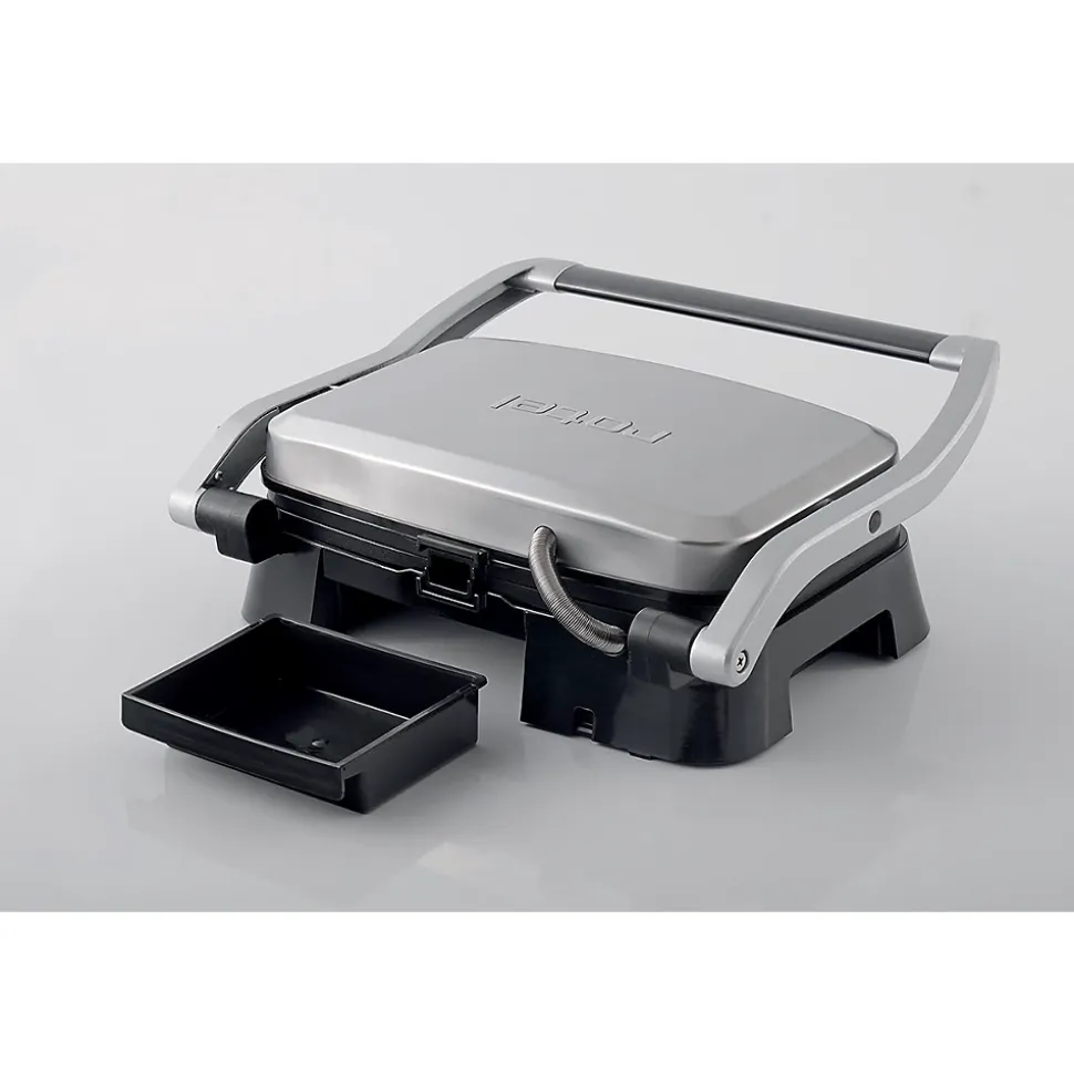 DESCRIPTION : Rotel vous propose ce gril à double plaque pour réaliser d’excellents tacos, dorer vos croque-monsieur, ou encore faire griller votre viandeLE PETIT + : L’appareil dispose d’un bac de récupération du jus et d’une rainure d’évacuation pour cuisiner sans salir le plan de travailCOMPOSITION : Métal, PlastiqueDIMENSIONS : 30,5×25,5x11cmENTRETIEN : Lavage avec une éponge humide et du savonRotel est une marque Suisse qui propose depuis plus de 70 ans des produits de petit électroménager performants, à usage domestique ou semi-professionnel. Que ce soit pour la cuisine ou le ménage, vous trouverez toujours les appareils qui répondent à vos besoins chez Rotel. De plus, avec leur design sobre et épuré, les appareils s’intègreront parfaitement chez vous. Rotel vous propose ce gril à double plaque.Le gril à double plaque Rotel dispose d’un revêtement antiadhésif et d’une rainure d’évacuation du jus ou des matières grasses. La plaque articulée de l’appareil permet de griller des aliments à épaisseur variable. Les plaques s’ouvrent à 180° et la poignée de la machine est thermo-isolante pour éviter les brûlures. Il y a un contrôle automatique de la température, et les témoins lumineux indiquent quand l’aliment est cuit.Il est fourni avec un bac de récupération du jus. Dimensions : 30.5 x 25,5 x 11 cm
