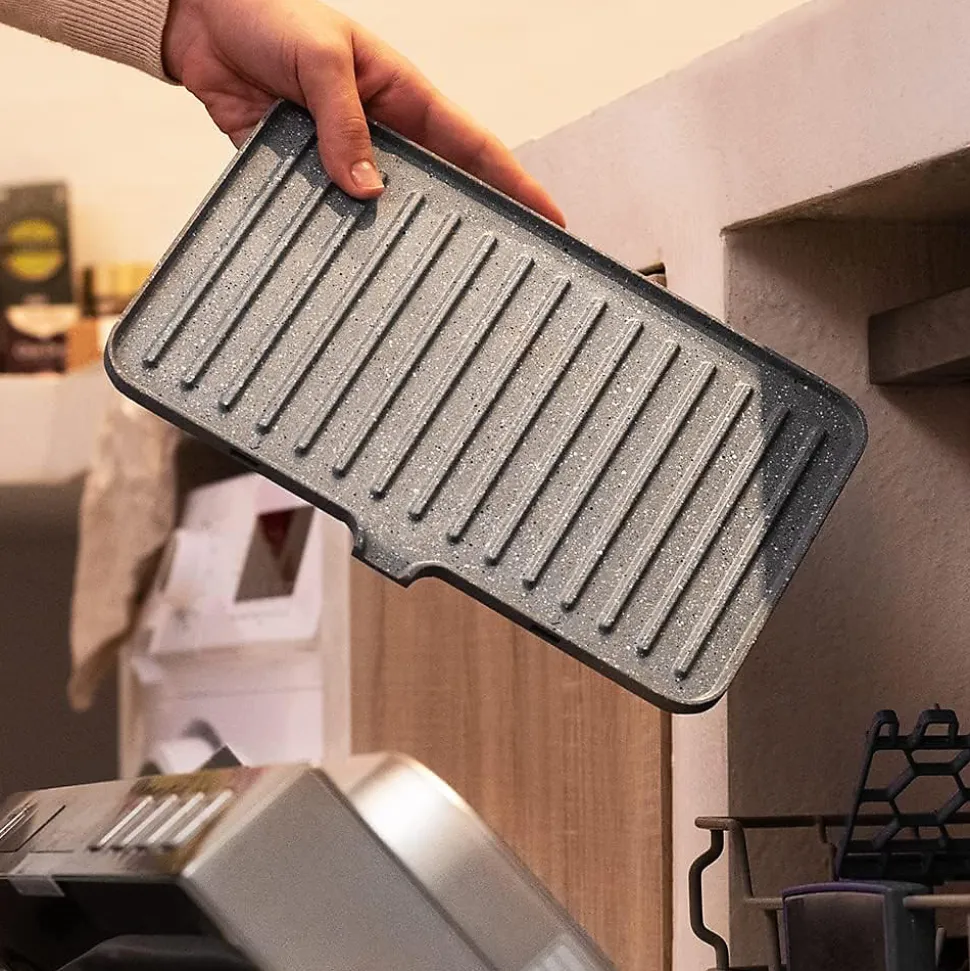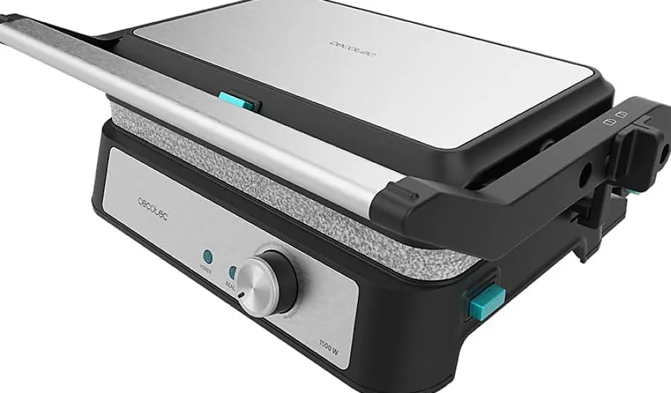 Le grill électrique Cecotec 1500 W avec plaques en pierre amovibles offre performance et praticité au quotidien. Son ouverture à 180° permet de maximiser la surface de cuisson de 28,7 x 17 cm pour griller viandes, poissons ou légumes. Le revêtement RockStone garantit une antiadhérence maximale et un nettoyage facile, sans PTFE ni PFOA. Les plaques démontables compatibles lave-vaisselle et le bac récupérateur de graisses assurent un entretien simple et rapide. Doté d’une plaque supérieure flottante, d’un indicateur lumineux, d’une poignée froide et d’un rangement vertical, il allie confort, sécurité et efficacité.