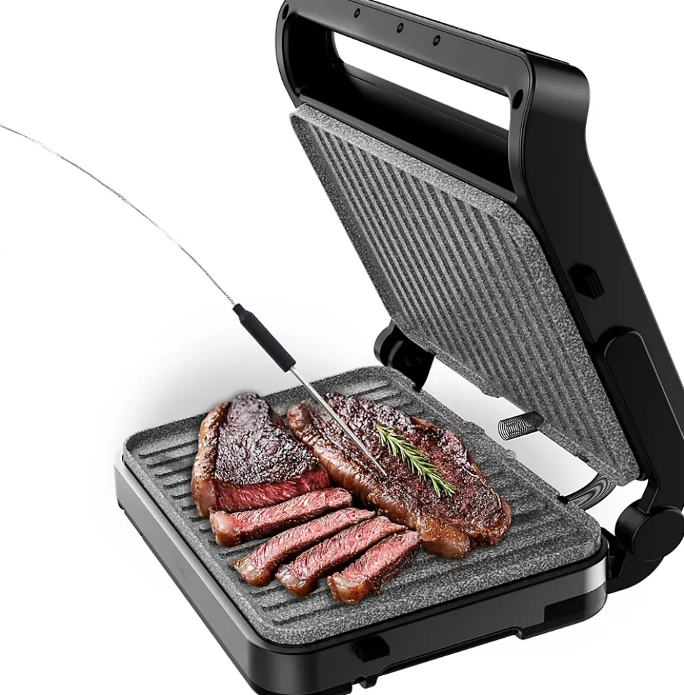 Le grill Cecotec 2000 W avec sonde de température intelligente garantit une cuisson précise et maîtrisée. La sonde contrôle et ajuste la température interne des aliments pour des résultats parfaits à chaque utilisation. Ses plaques doubles peuvent chauffer séparément de 80 à 230 °C, offrant une grande flexibilité pour différentes préparations. Sa large surface de 30 x 23 cm permet de cuisiner pour toute la famille. Les plaques amovibles compatibles lave-vaisselle et le bac récupérateur de graisse facilitent le nettoyage. Son couvercle en verre et son corps en acier inoxydable apportent robustesse et élégance à votre cuisine.