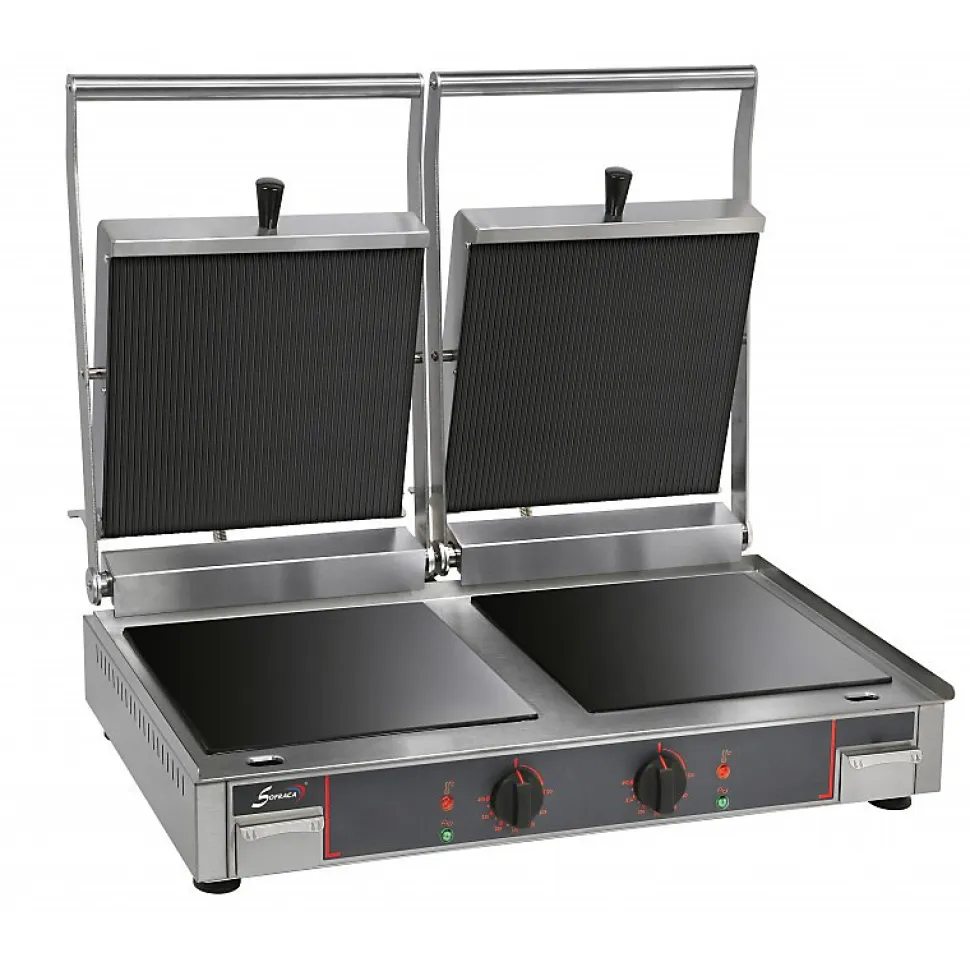 Grill panini double de la marque Sofraca Nettoyage facile & une cuisson sans odeurIdéal pour viande, panini, poissonSouplesse d’utilisation et bonne prise en main grâce au cadre épais2 Thermostats de chaleur 0-350°C2 Poignées inox2 Minuteries électronique pour la programmation de 3 temps de cuisson indépendantsVoyant de contrôle2 tiroirs amoviblesCaractéristiques techniques :Tension : 230VLargeur : 780mmProfondeur : 600mmHauteur : 260mmPoids : 20 kilosPuissance : (2x) 3000WSurface utile : (2x) 335 x 304mmPlaque inférieure lisse et plaque supérieure rainurée