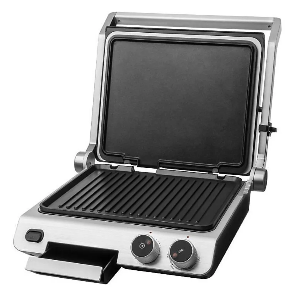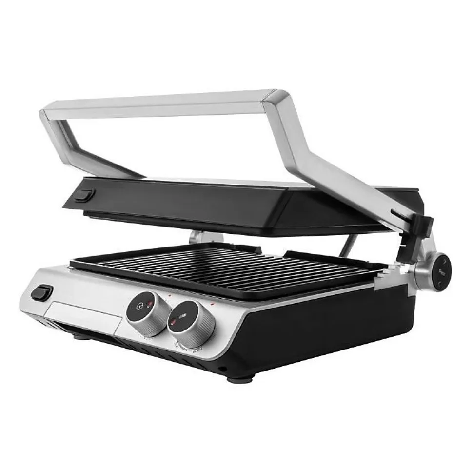 Découvrez le grill de contact SBG 5030BK, avec un design exclusif en verre et des plaques de grill antiadhésives de 3eme génération avec une spirale de chauffage intégrée. Il offre la possibilité de griller sans ajouter d’huile et dispose de deux types de plaques : une plaque supérieure lisse et une plaque inférieure nervurée. Il propose 3 positions de fonctionnement (fermé, ouvert à 90°, ouvert à 180°) et est équipé d’un bac a huile amovible, de plaques de grill lavables au lave-vaisselle, et d’un minuteur de 30 minutes. Sa poignée isolée thermiquement est également adaptée pour presser des sandwiches.